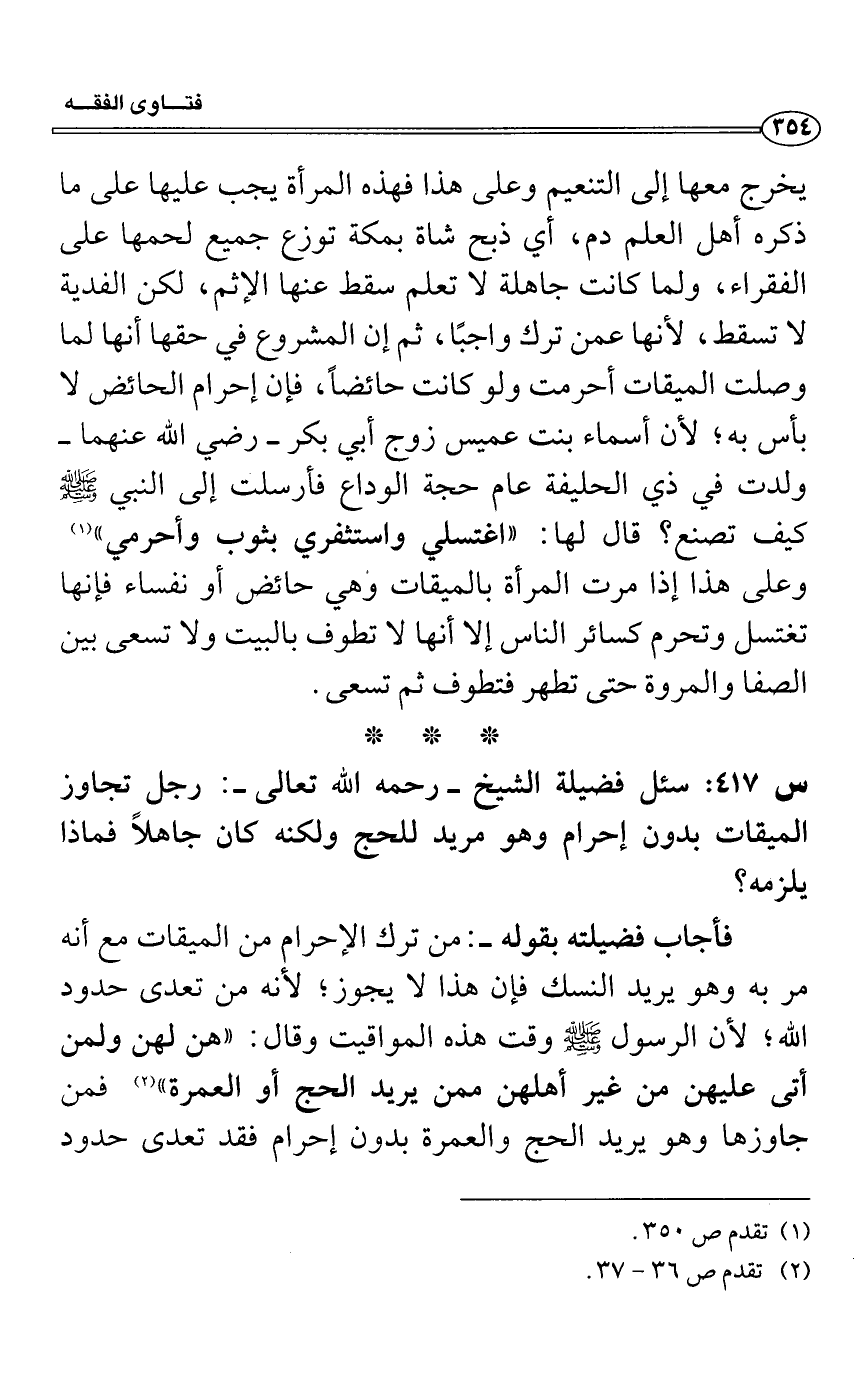 فأجاب فضيلته بقوله-: من ترك الإحرام من الميقات مع أنه مر به وهو يريد النسك فإن هذا لا يجوز؛ لأنه من تعدى حدود الله؛ لأن الرسول - صلى الله عليه وسلم - وقت هذه المواقيت وقال: "هن لهن ولمن أتى عليهن من غير أهلهن ممن يريد الحج أو العمرة" (2) فمن جاوزها وهو يريد الحج والعمرة بدون إحرام فقد تعدى حدود