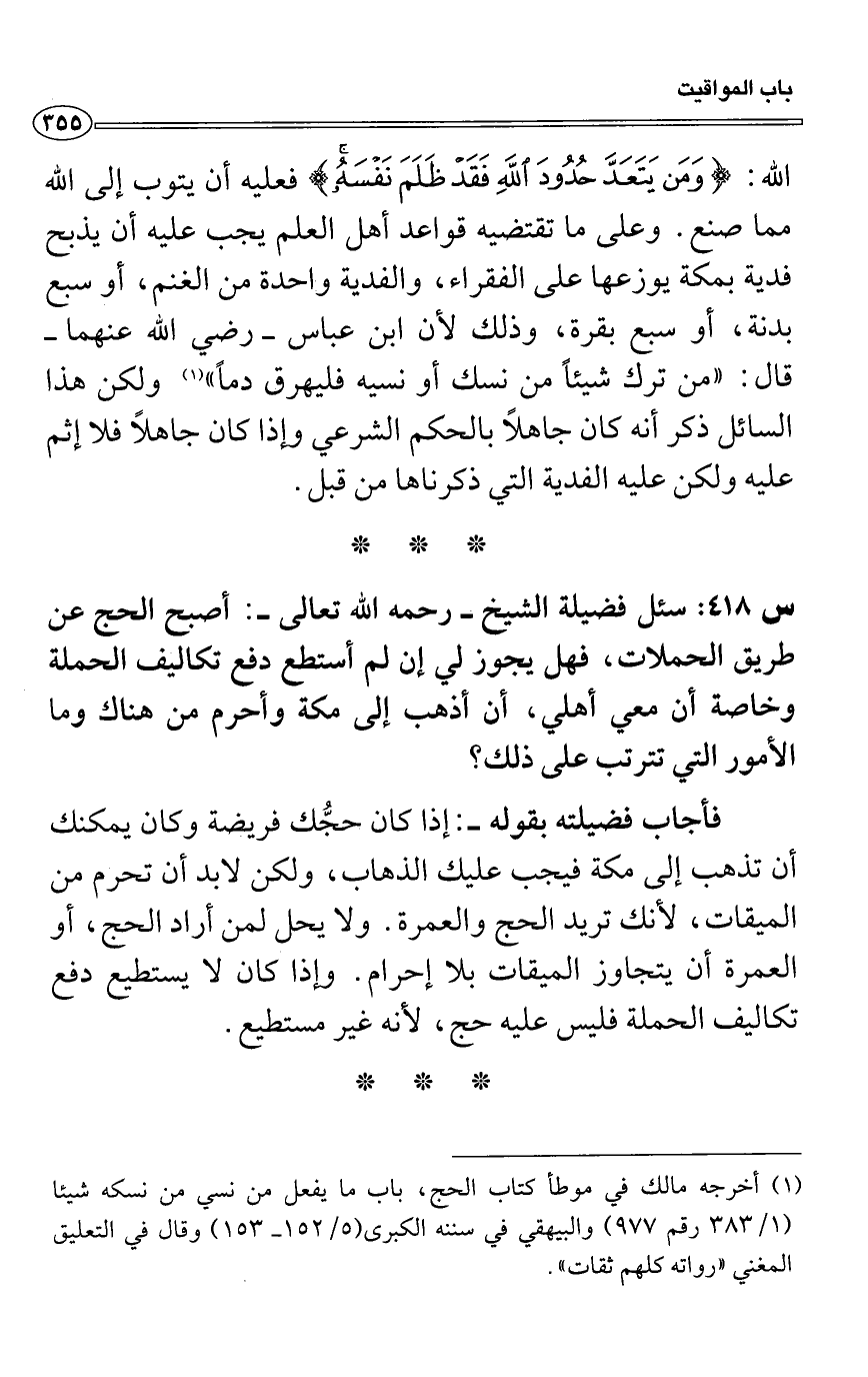(1) أخرجه مالك في موطأ كتاب الحج، باب ما يفعل من نسي من نسكه شيئاً (1/383 رقم 977) والبيهقي في سننه الكبرى (5/152- 153) وقال في التعليق المغني "رواته كلهم ثقات".