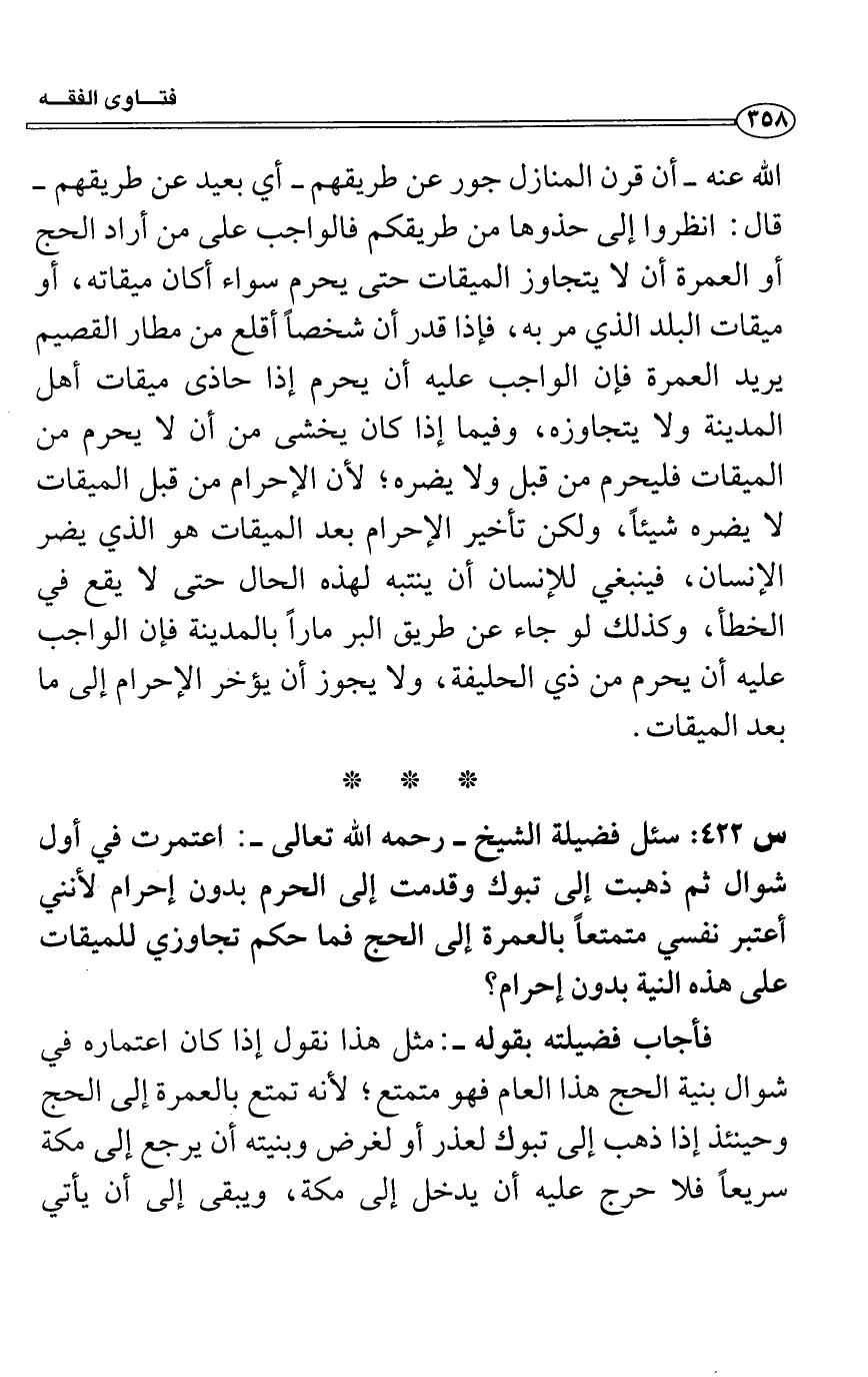 س 422: سئل فضيلة الشيخ- رحمه الله تعالى-: اعتمرت في أول شوال ثم ذهبت إلى تبوك وقدمت إلى الحرم بدون إحرام لأنني أعتبر نفسي متمتعاً بالعمرة إلى الحج فما حكم تجاوزي للميقات