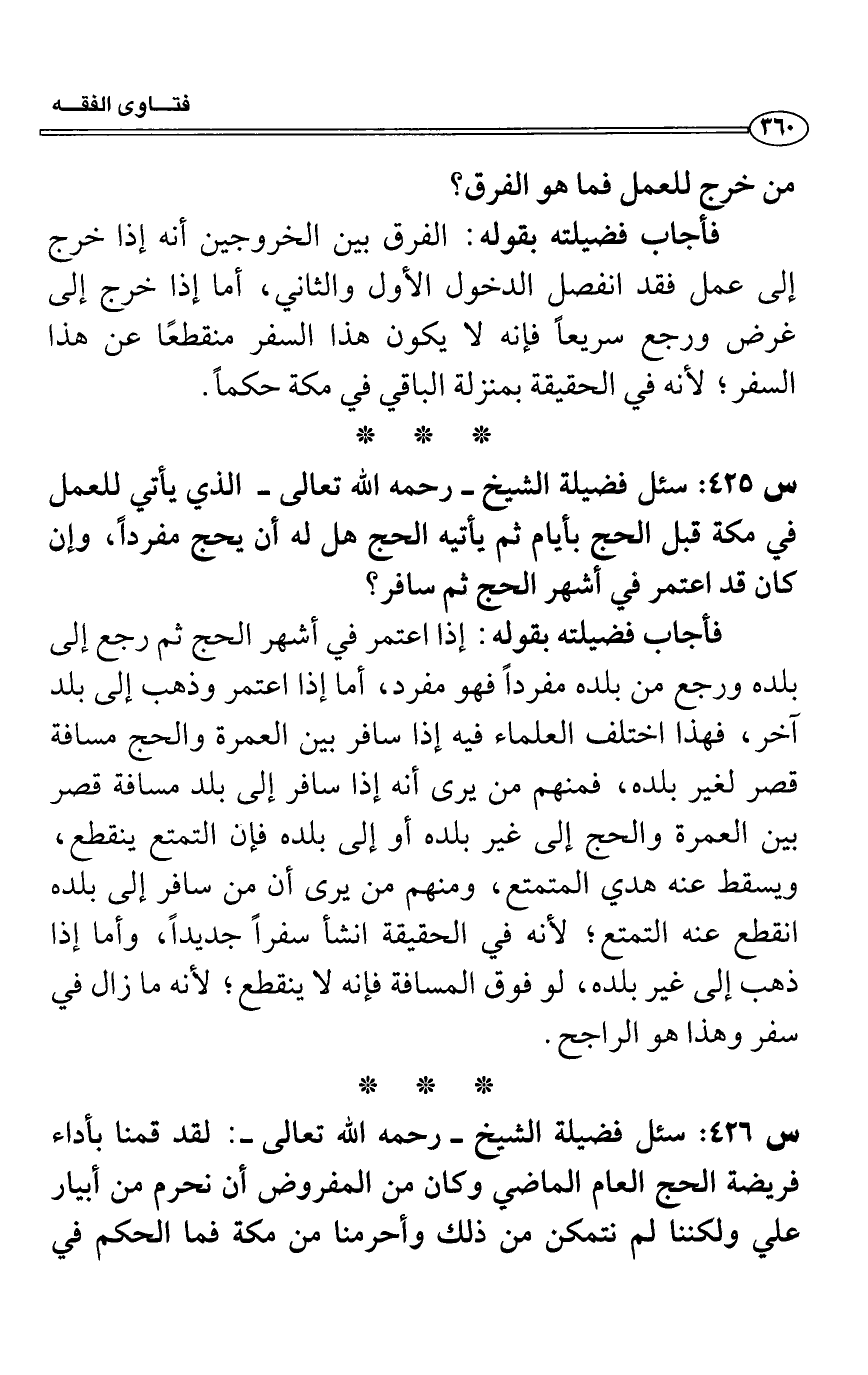 س 425: سئل فضيلة الشيخ- رحمه الله تعالى- الذي يأتي للعمل في مكة قبل الحج بأيام ثم يأتيه الحج هل له أن يحج مفرداً، وإن كان قد اعتمر في أشهر الحج ثم سافر؟