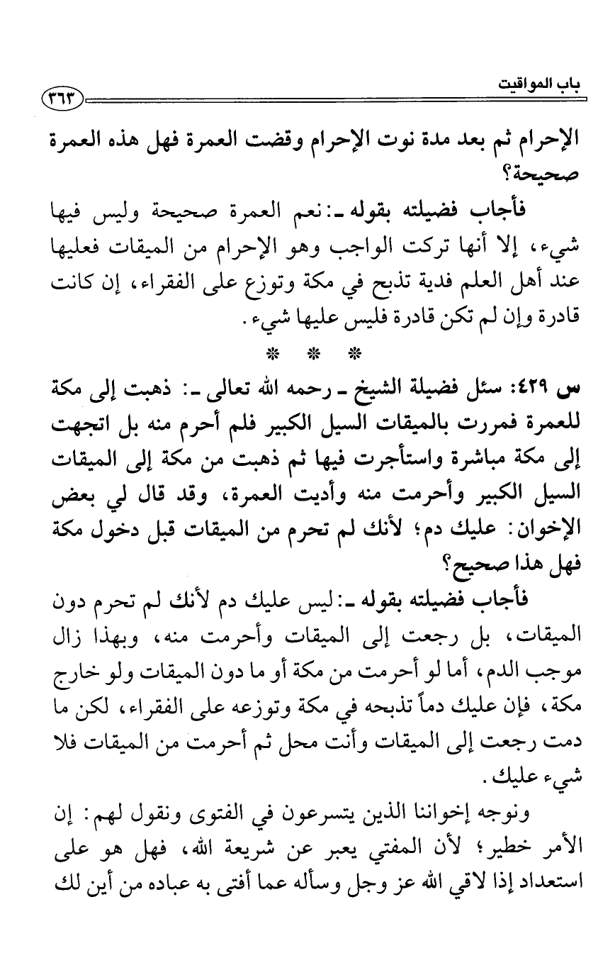 س 429: سئل فضيلة الشيخ- رحمه الله تعالى-: ذهبت إلى مكة للعمرة فمررت بالميقات السيل الكبير فلم أحرم منه بل اتجهت إلى مكة مباشرة واستأجرت فيها ثم ذهبت من مكة إلى الميقات