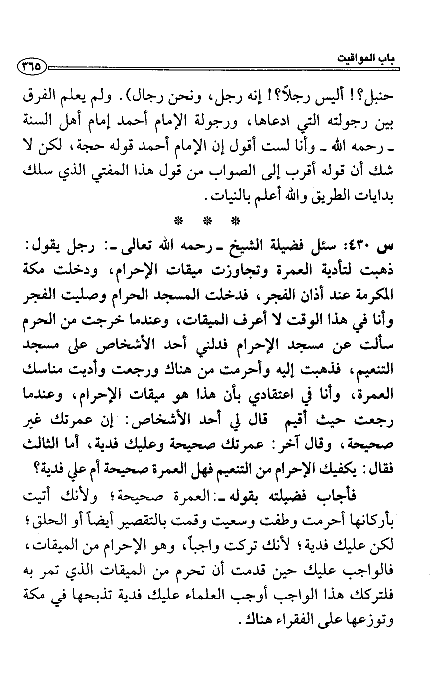س 430: سئل فضيلة الشيخ- رحمه الله تعالى-: رجل يقول: ذهبت لتأدية العمرة وتجاوزت ميقات الإحرام، ودخلت مكة المكرمة عند أذان الفجر، فدخلت المسجد الحرام وصليت الفجر