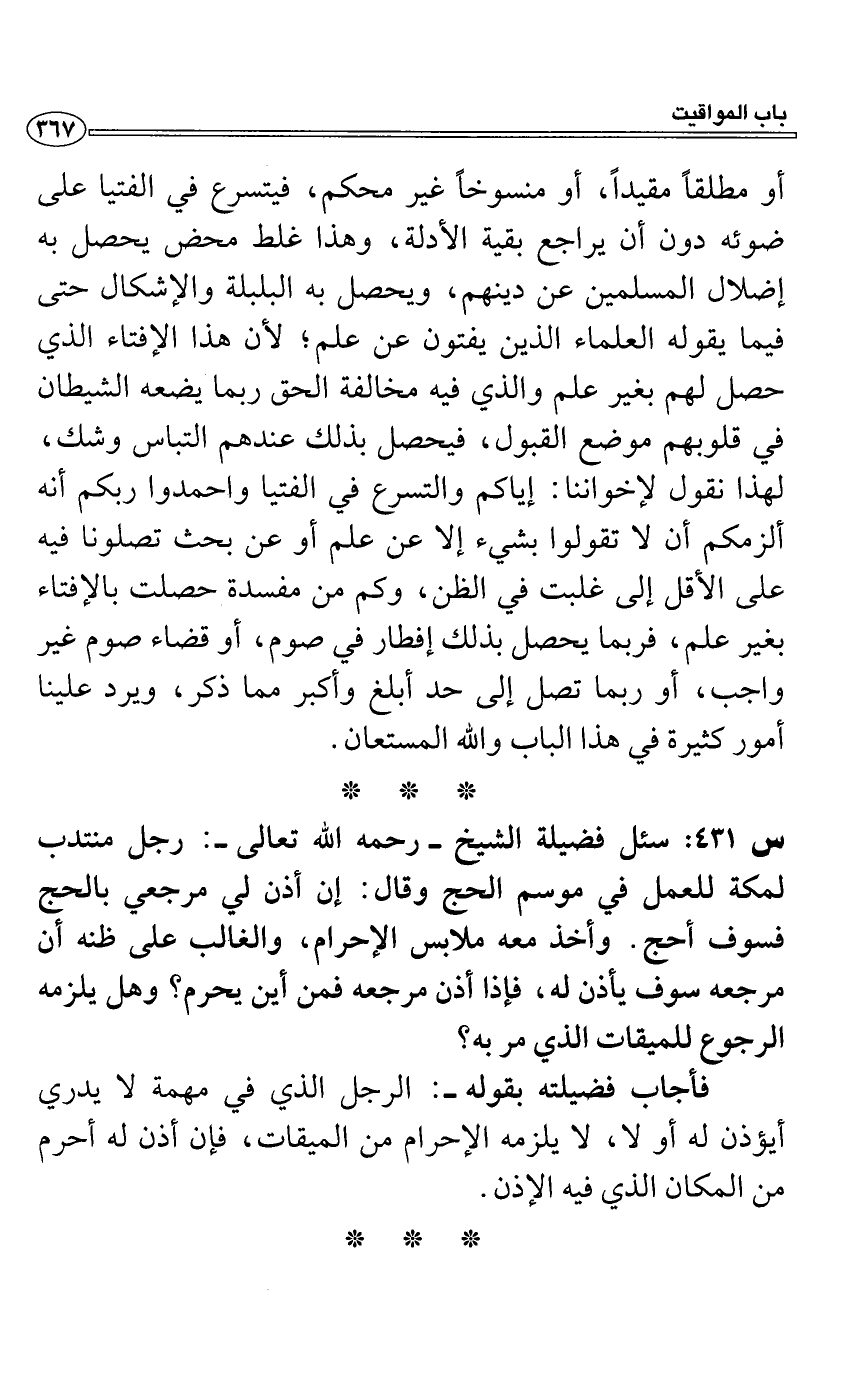 س 431: سئل فضيلة الشيخ- رحمه الله تعالى-: رجل منتدب لمكة للعمل في موسم الحج وقال: إن أذن لي مرجعي بالحج فسوف أحج. وأخذ معه ملابس الإحرام، والغالب على ظنه أن مرجعه سوف يأذن له، فإذا أذن مرجعه فمن أين يحرم؟ وهل يلزمه الرجوع للميقات الذي مر به؟
