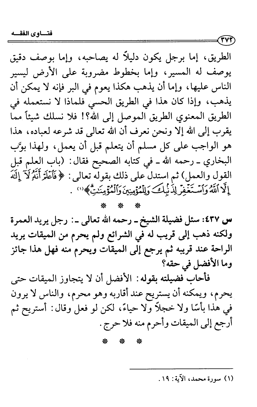 الطريق، إما برجل يكون دليلاً له يصاحبه، وإما بوصف دقيق يوصف له المسير، وإما بخطوط مضروبة على الأرض ليسير الناس عليها، وإما أن يذهب هكذا يعوم في البر فإنه لا يمكن أن يذهب، وإذا كان هذا في الطريق الحسي فلماذا لا نستعمله في الطريق المعنوي الطريق الموصل إلى الله؟! فلا نسلك شيئاً مما يقرب إلى الله إلا ونحن نعرف أن الله تعالى قد شرعه لعباده، هذا هو الواجب على كل مسلم أن يتعلم قبل أن يعمل، ولهذا بوَّب البخاري- رحمه الله- في كتابه الصحيح فقال: (باب العلم قبل القول والعمل) ثم استدل على ذلك بقوله تعالى: (فَاعْلَمْ أَنَّهُ لَا إِلَهَ إِلَّا اللَّهُ وَاسْتَغْفِرْ لِذَنْبِكَ وَلِلْمُؤْمِنِينَ وَالْمُؤْمِنَاتِ) (1) .