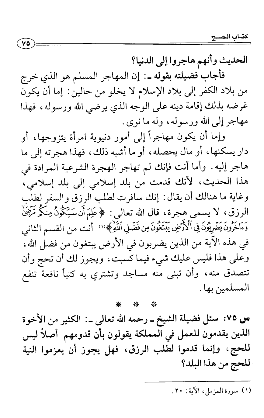 س 75: سئل فضيلة الشيخ- رحمه الله تعالى-: الكثير من الأخوة الذين يقدمون للعمل في المملكة يقولون بأن قدومهم أصلاً ليس للحج، وإنما قدموا لطلب الرزق، فهل يجوز أن يعزموا النية