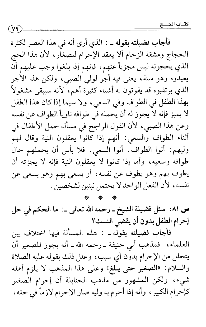 س 81: سئل فضيلة الشيخ- رحمه الله تعالى-: ما الحكم في حل إحرام الطفل بدون أن يقضي النسك؟