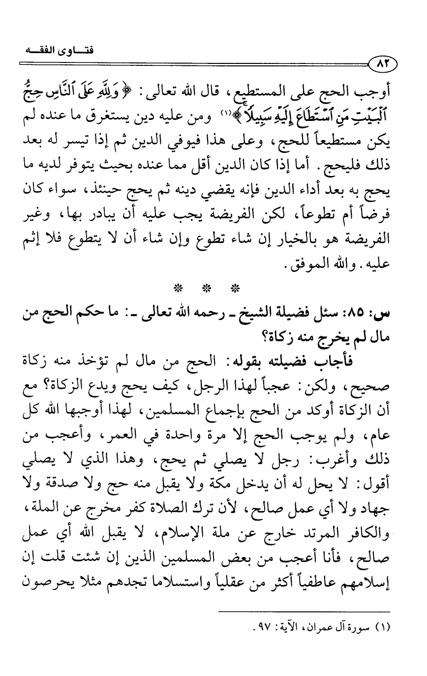س 85: سئل فضيلة الشيخ- رحمه الله تعالى-: ما حكم الحج من مال لم يخرج منه زكاة؟
