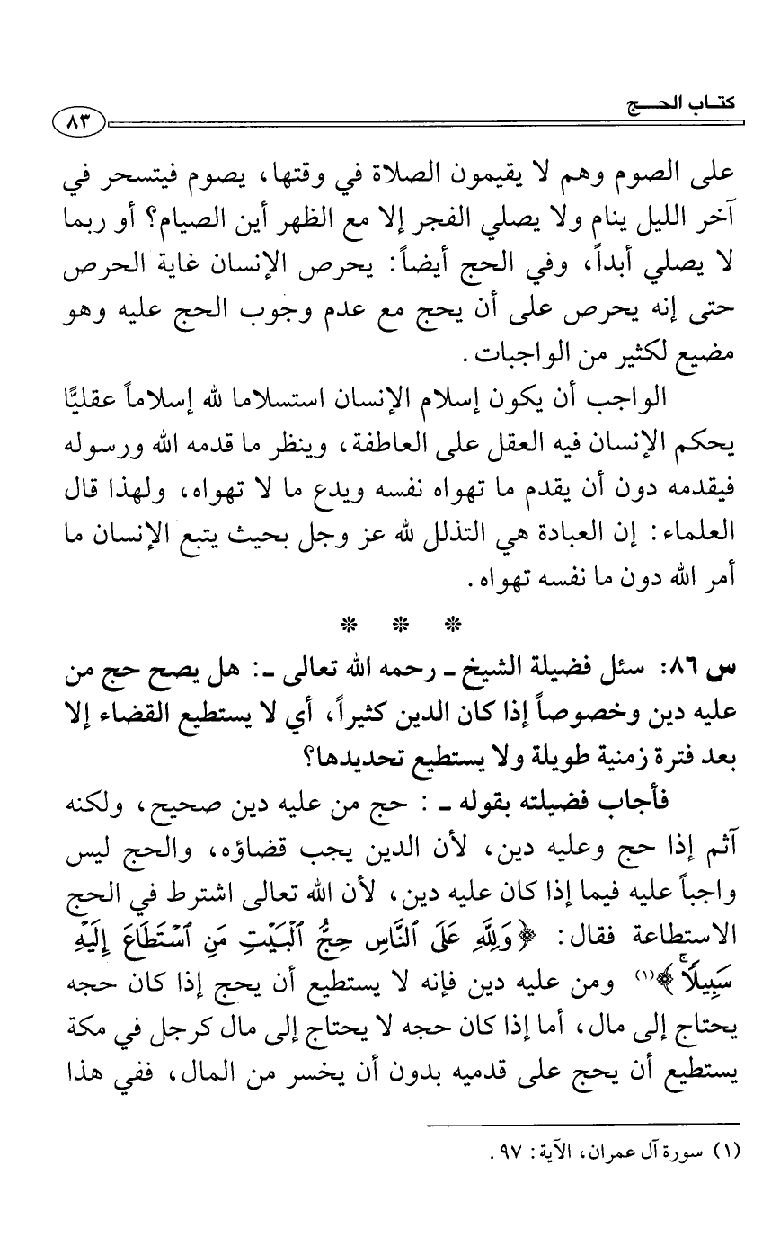 الاستطاعة فقال: (وَلِلَّهِ عَلَى النَّاسِ حِجُّ الْبَيْتِ مَنِ اسْتَطَاعَ إِلَيْهِ سَبِيلًا) (1) ومن عليه دين فإنه لا يستطيع أن يحج إذا كان حجه يحتاج إلى مال، أما إذا كان حجه لا يحتاج إلى مال كرجل في مكة