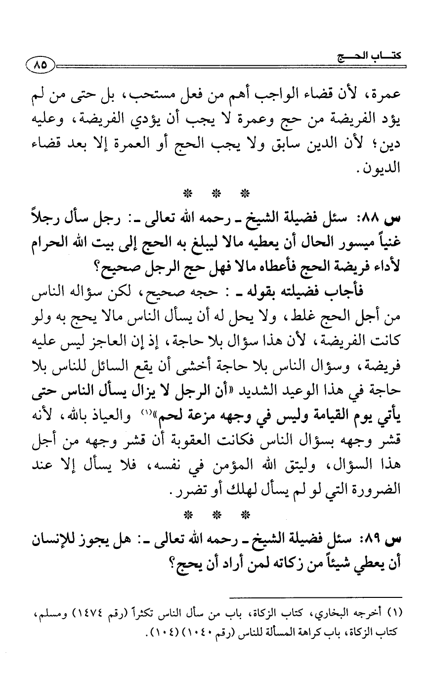 س 88: سئل فضيلة الشيخ- رحمه الله تعالى-: رجل سأل رجلاً غنياً ميسور الحال أن يعطيه مالا ليبلغ به الحج إلى بيت الله الحرام لأداء فريضة الحج فأعطاه مالا فهل حج الرجل صحيح؟