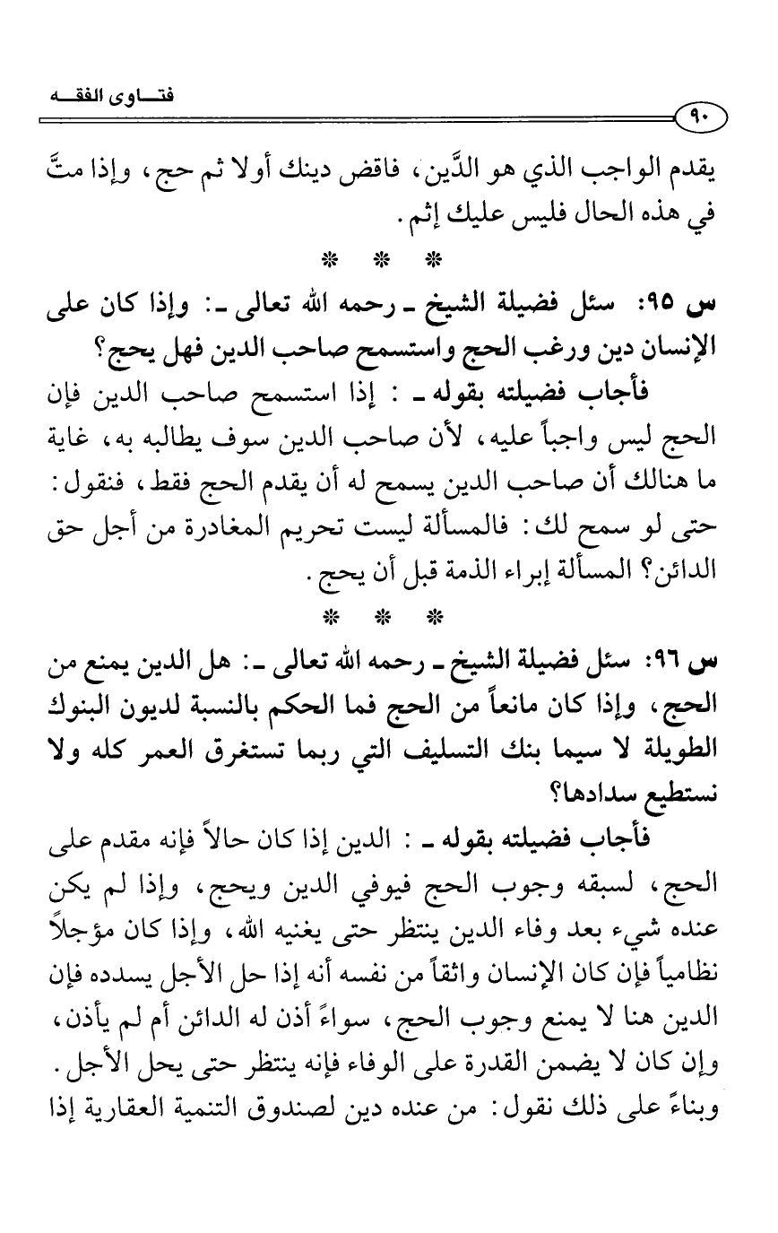 س 96: سئل فضيلة الشيخ- رحمه الله تعالى-: هل الدين يمنع من الحج، وإذا كان مانعاً من الحج فما الحكم بالنسبة لديون البنوك الطويلة لا سيما بنك التسليف التي ربما تستغرق العمر كله ولا