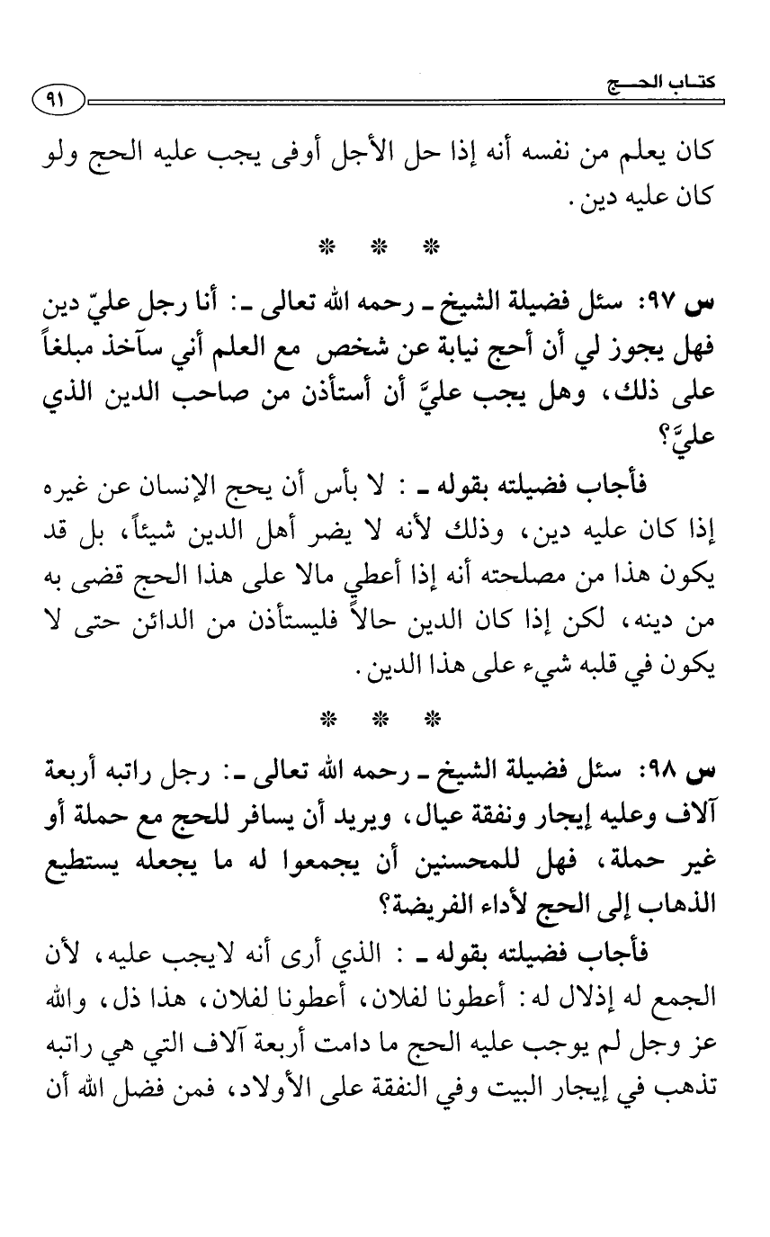 س 97: سئل فضيلة الشيخ- رحمه الله تعالى-: أنا رجل عليّ دين فهل يجوز لي أن أحج نيابة عن شخص مع العلم أني سآخذ مبلغاً على ذلك، وهل يجب عليَّ أن أستأذن من صاحب الدين الذي