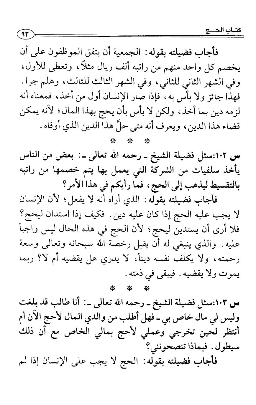 س 102: سئل فضيلة الشيخ- رحمه الله تعالى-: بعض من الناس يأخذ سلفيات من الشركة التي يعمل بها يتم خصمها من راتبه بالتقسيط ليذهب إلى الحج، فما رأيكم في هذا الأمر؟