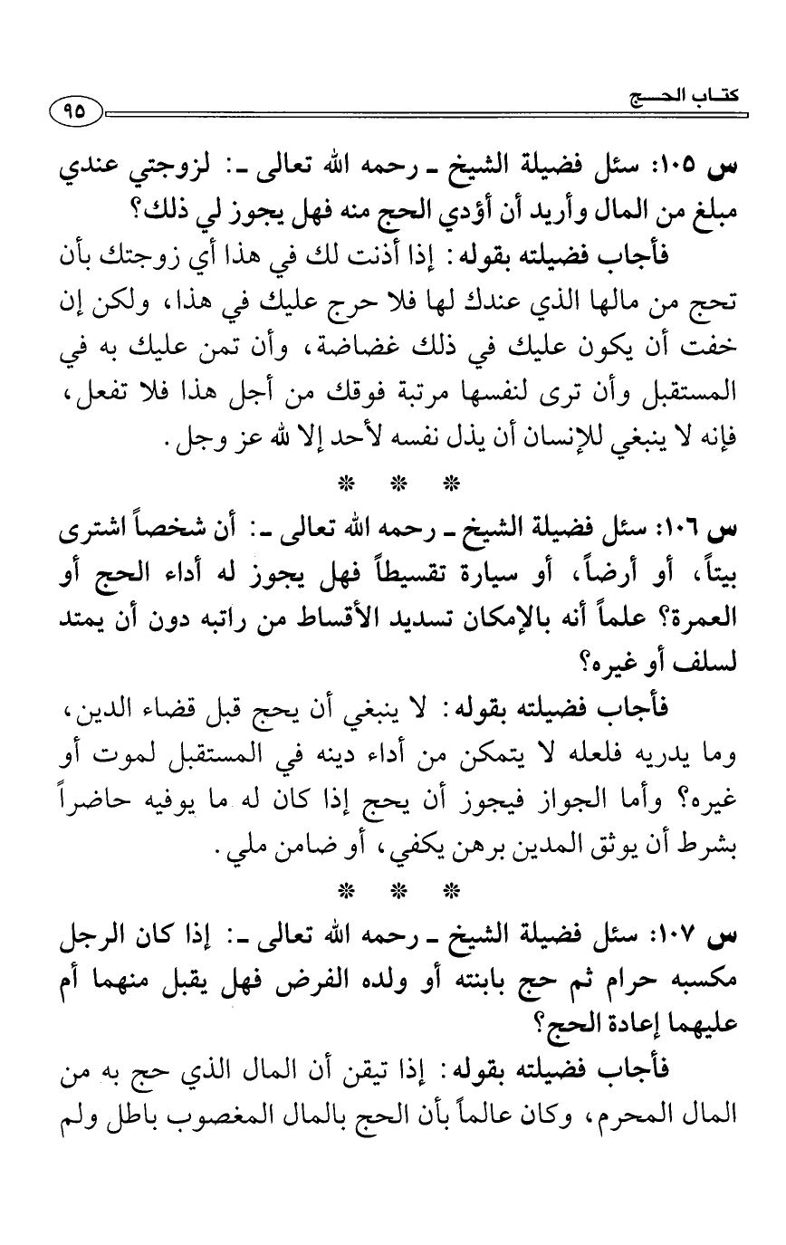 س 105: سئل فضيلة الشيخ- رحمه الله تعالى-: لزوجتي عندي مبلغ من المال وأريد أن أؤدي الحج منه فهل يجوز لي ذلك؟