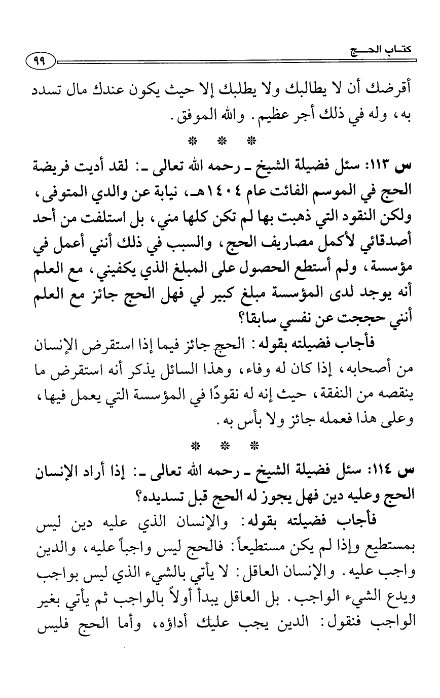 س 114: سئل فضيلة الشيخ- رحمه الله تعالى-: إذا أراد الإنسان الحج وعليه دين فهل يجوز له الحج قبل تسديده؟