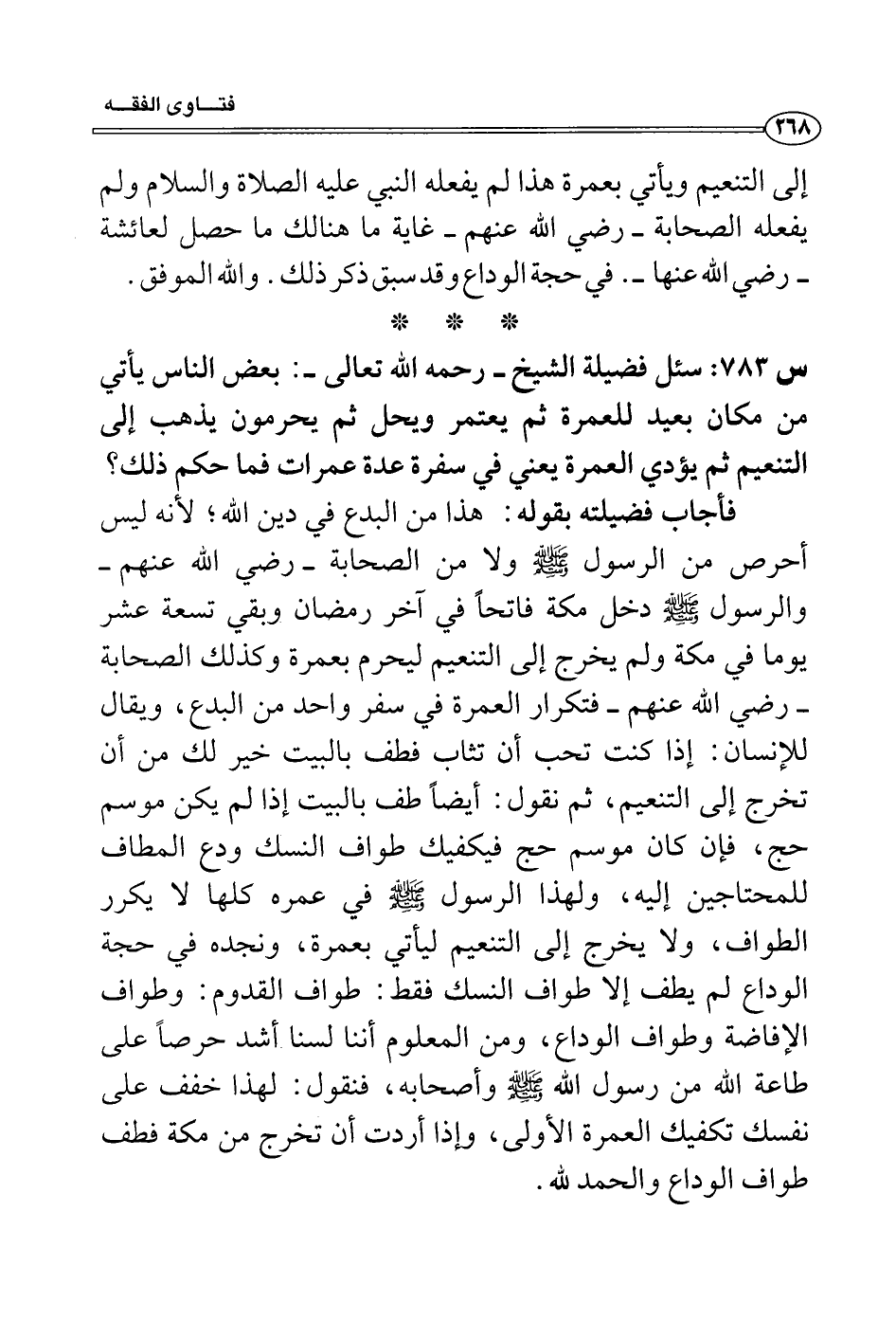 س 783: سئل فضيلة الشيخ- رحمه الله تعالى-: بعض الناس يأتي من مكان بعيد للعمرة ثم يعتمر ويحل ثم يحرمون يذهب إلى التنعيم ثم يؤدي العمرة يعني في سفرة عدة عمرات فما حكم ذلك؟