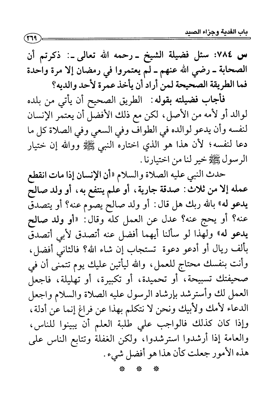 س 784: سئل فضيلة الشيخ- رحمه الله تعالى-: ذكرتم أن الصحابة- رضي الله عنهم- لم يعتمروا في رمضان إلا مرة واحدة فما الطريقة الصحيحة لمن أراد أن يأخذ عمرة لأحد والديه؟