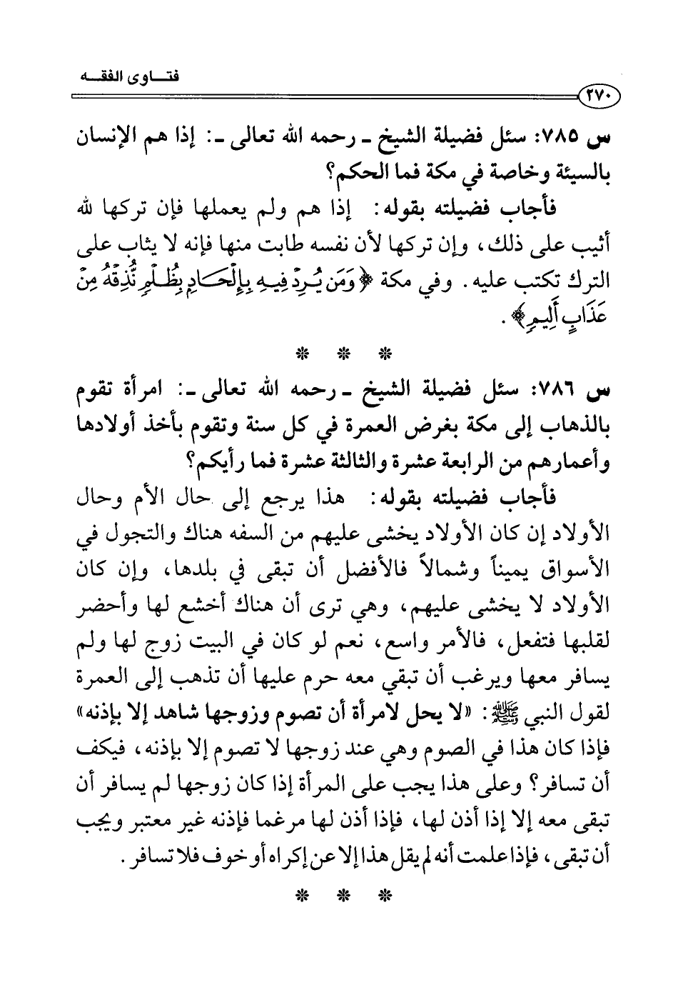 فأجاب فضيلته بقوله: هذا يرجع إلى حال الأم وحال الأولاد إن كان الأولاد يخشى عليهم من السفه هناك والتجول في الأسواق يميناً وشمالاً فالأفضل أن تبقى في بلدها، وإن كان الأولاد لا يخشى عليهم، وهي ترى أن هناك أخشع لها وأحضر لقلبها فتفعل، فالأمر واسع، نعم لو كان في البيت زوج لها ولم يسافر معها ويرغب أن تبقي معه حرم عليها أن تذهب إلى العمرة لقول النبي - صلى الله عليه وسلم -: " لا يحل لامرأة أن تصوم وزوجها شاهد إلا بإذنه " فإذا كان هذا في الصوم وهي عند زوجها لا تصوم إلا بإذنه، فكيف أن تسافر؟ وعلى هذا يجب على المرأة إذا كان زوجها لم يسافر أن تبقى معه إلا إذا أذن لها، فإذا أذن لها مرغما فإذنه غير معتبر ويجب أن تبقى، فإذا علمت أنه لم يقل هذا إلا عن إكراه أوخوف فلا تسافر.