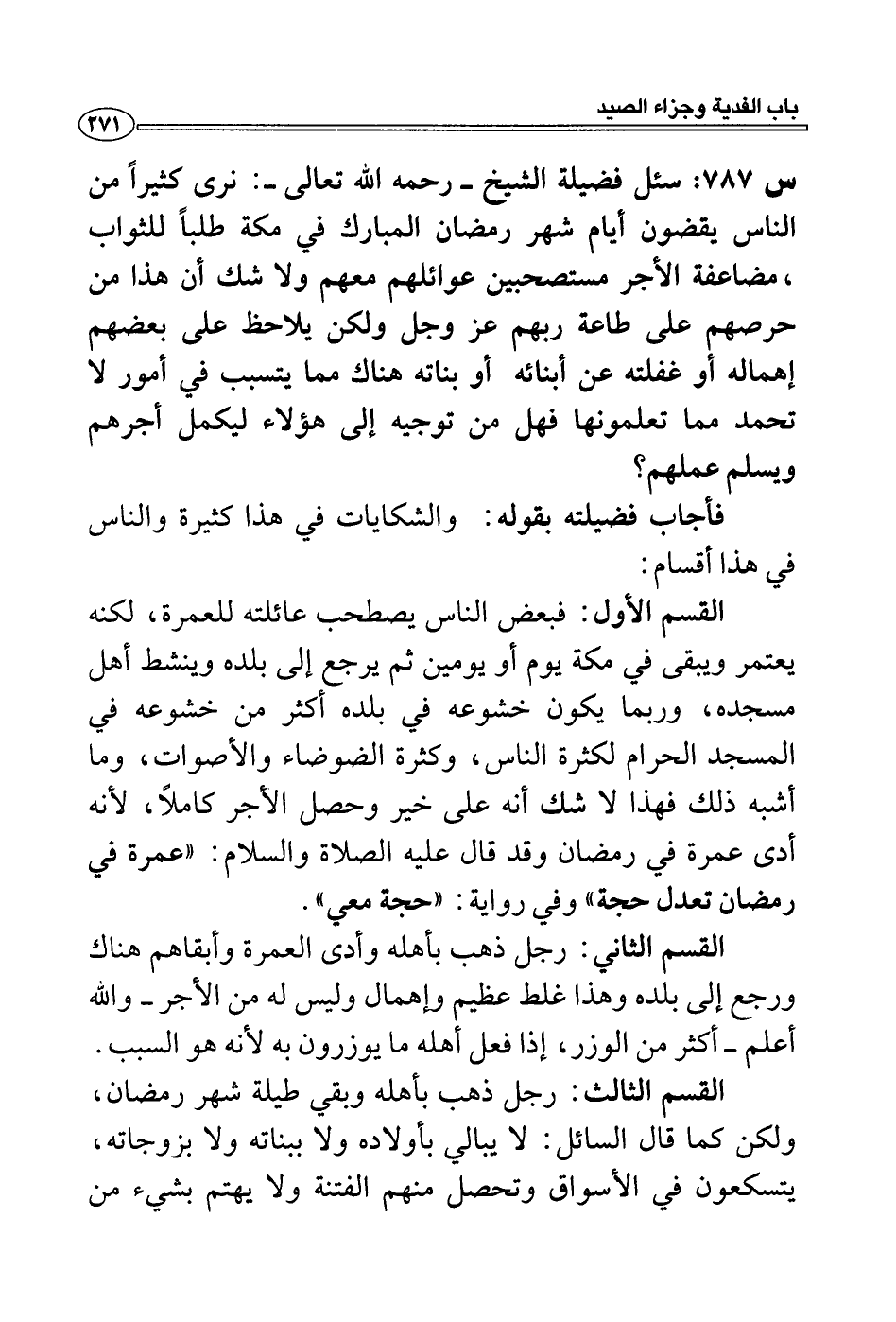 س 787: سئل فضيلة الشيخ- رحمه الله تعالى-: نرى كثيراً من الناس يقضون أيام شهر رمضان المبارك في مكة طلباً للثواب، مضاعفة الأجر مستصحبين عوائلهم معهم ولا شك أن هذا من