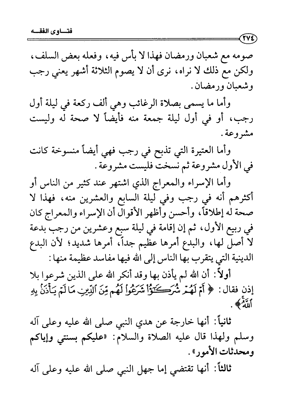 وأما الإسراء والمعراج الذي اشتهر عند كثير من الناس أو أكثرهم أنه في رجب وفي ليلة السابع والعشرين منه، فهذا لا صحة له إطلاقاً، وأحسن وأظهر الأقوال أن الإسراء والمعراج كان في ربيع الأول، ثم إن إقامة في ليلة سبع وعشرين من رجب بدعة لا أصل لها، والبدع أمرها عظيم جداً، أمرها شديد؛ لأن البدع الدينية التي يتقرب بها الناس إلى الله فيها مفاسد عظيمة منها: