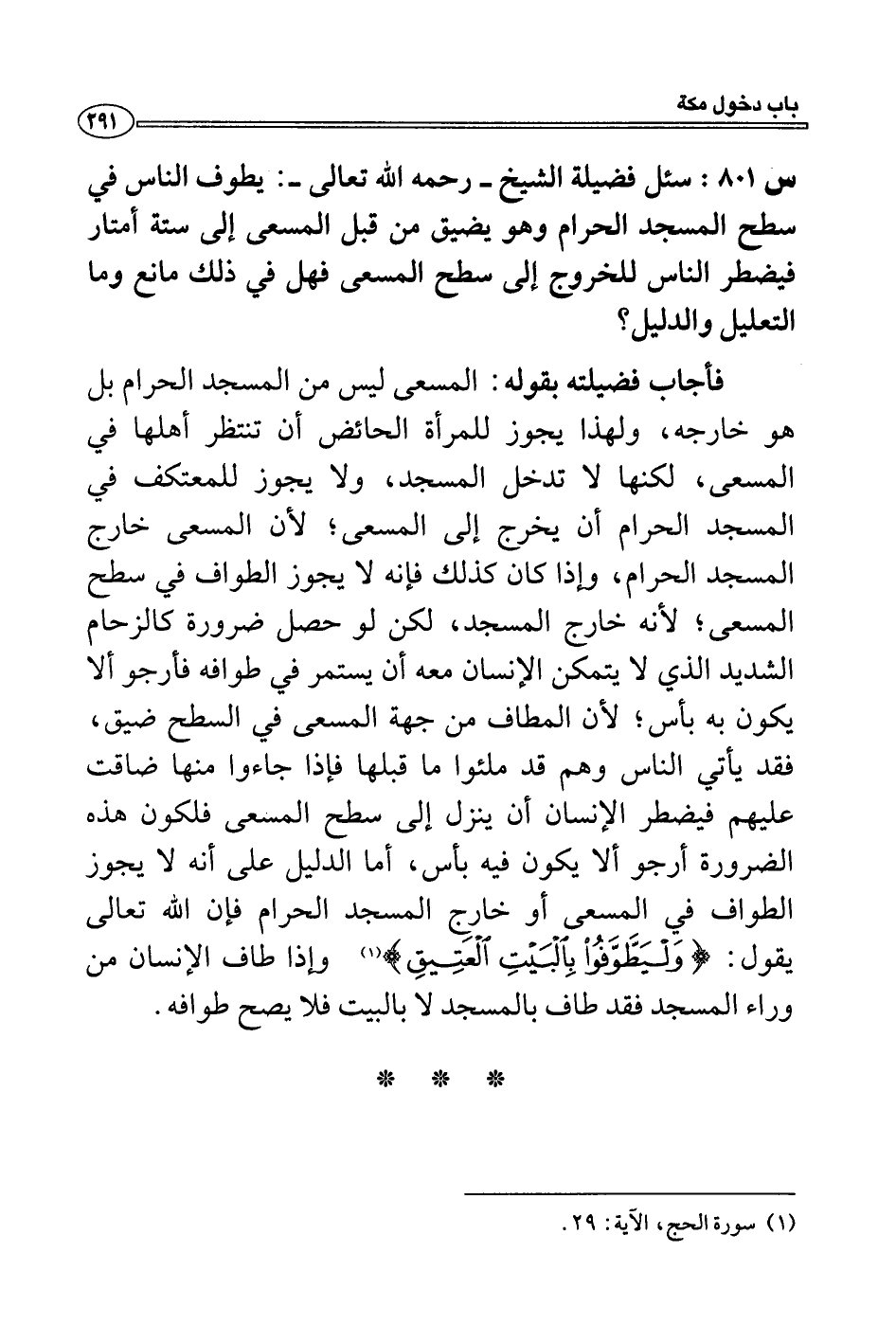 س 801: سئل فضيلة الشيخ- رحمه الله تعالى-: يطوف الناس في سطح المسجد الحرام وهو يضيق من قبل المسعى إلى ستة أمتار فيضطر الناس للخروج إلى سطح المسعى فهل في ذلك مانع وما