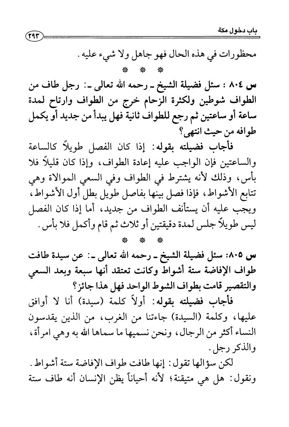 س 804: سئل فضيلة الشيخ- رحمه الله تعالى-: رجل طاف من الطواف شوطين ولكثرة الزحام خرج من الطواف وارتاح لمدة ساعة أو ساعتين ثم رجع للطواف ثانية فهل يبدأ من جديد أو يكمل