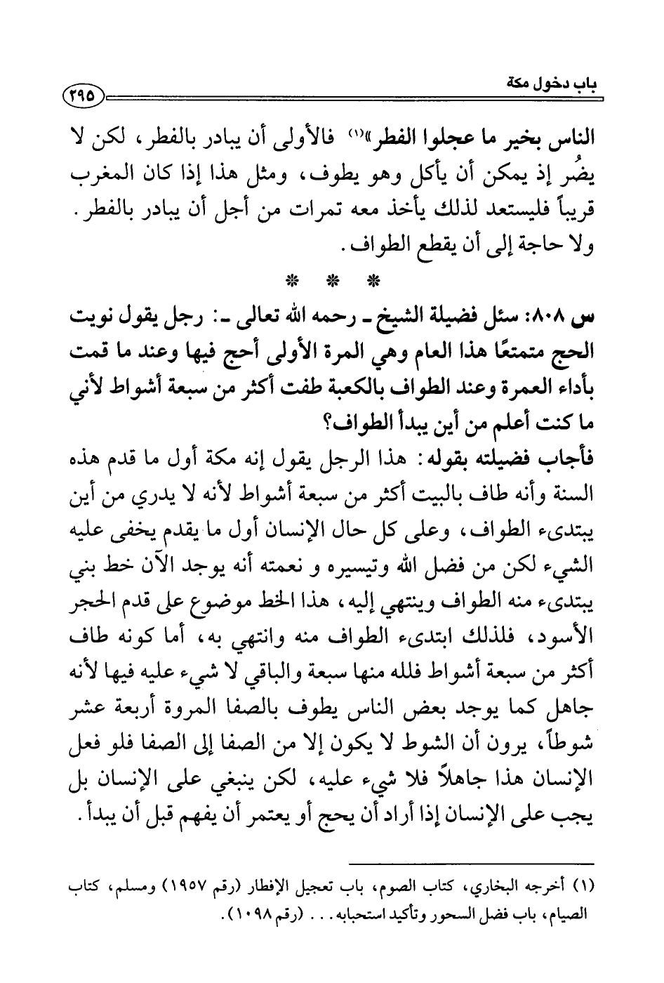 فأجاب فضيلته بقوله: هذا الرجل يقول إنه مكة أول ما قدم هذه السنة وأنه طاف بالبيت أكثر من سبعة أشواط لأنه لا يدري من أين يبتدىء الطواف، وعلى كل حال الإنسان أول ما يقدم يخفى عليه الشيء لكن من فضل الله وتيسيره ونعمته أنه يوجد الآن خط بني يبتدىء منه الطواف وينتهي إليه، هذا الخط موضوع على قدم الحجر الأسود، فلذلك ابتدىء الطواف منه وانتهي به، أما كونه طاف أكثر من سبعة أشواط فلله منها سبعة والباقي لا شيء عليه فيها لأنه جاهل كما يوجد بعض الناس يطوف بالصفا المروة أربعة عشر شوطاً، يرون أن الشوط لا يكون إلا من الصفا إلى الصفا فلو فعل الإنسان هذا جاهلاً فلا شيء عليه، لكن ينبغي على الإنسان بل يجب على الإنسان إذا أراد أن يحج أو يعتمر أن يفهم قبل أن يبدأ.