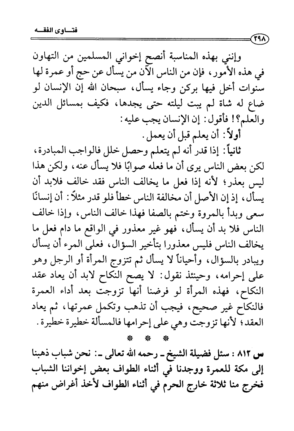 وإنني بهذه المناسبة أنصح إخواني المسلمين من التهاون في هذه الأمور، فإن من الناس الآن من يسأل عن حج أو عمرة لها سنوات أخل فيها بركن وجاء يسأل، سبحان الله إن الإنسان لو ضاع له شاة لم يبت ليلته حتى يجدها، فكيف بمسائل الدين والعلم؟! فأقول: إن الإنسان يجب عليه: