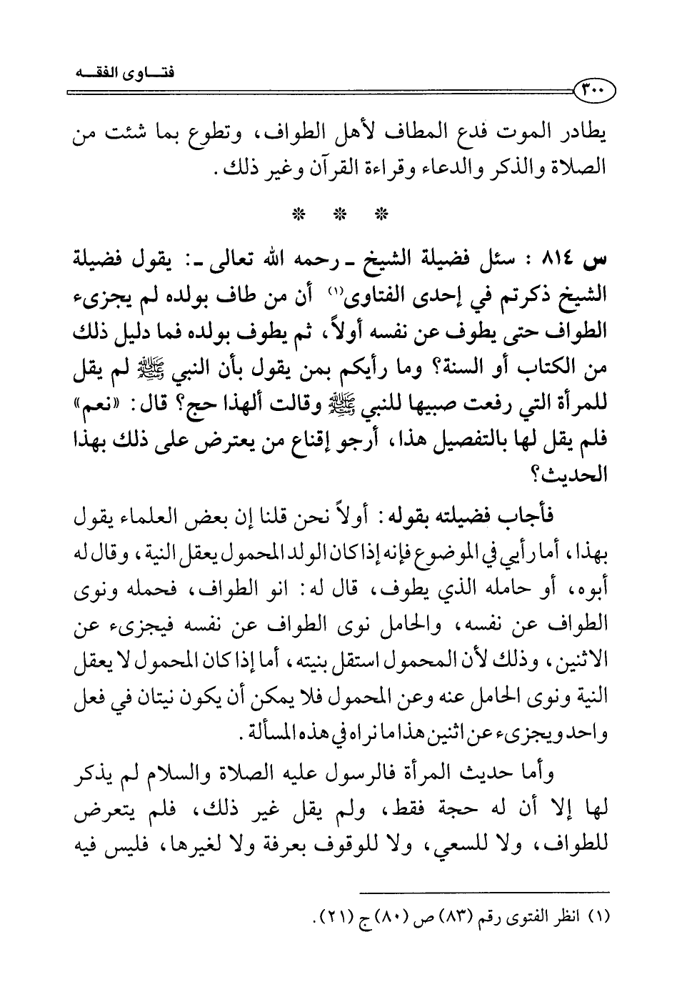 س 814: سئل فضيلة الشيخ- رحمه الله تعالى-: يقول فضيلة الشيخ ذكرتم في إحدى الفتاوى (1) أن من طاف بولده لم يجزىء الطواف حتى يطوف عن نفسه أولاً، ثم يطوف بولده فما دليل ذلك من الكتاب أو السنة؟ وما رأيكم بمن يقول بأن النبي - صلى الله عليه وسلم - لم يقل للمرأة التي رفعت صبيها للنبي - صلى الله عليه وسلم - وقالت ألهذا حج؟ قال: "نعم " فلم يقل لها بالتفصيل هذا، أرجو إقناع من يعترض على ذلك بهذا الحديث؟