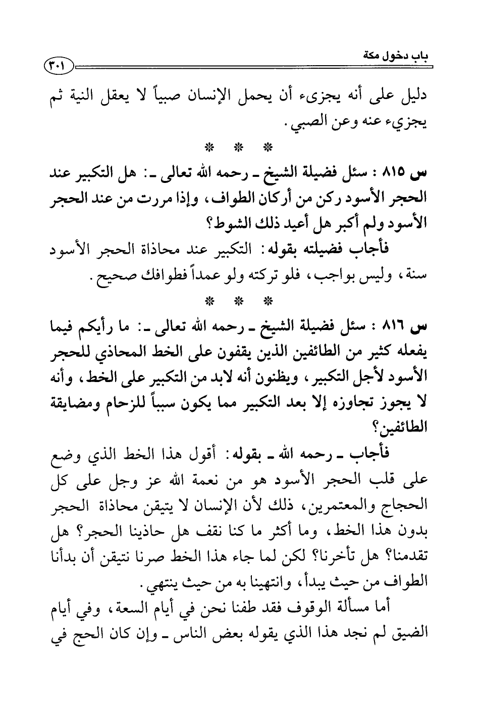 س 816: سئل فضيلة الشيخ- رحمه الله تعالى-: ما رأيكم فيما يفعله كثير من الطائفين الذين يقفون على الخط المحاذي للحجر الأسود لأجل التكبير، ويظنون أنه لابد من التكبير على الخط، وأنه لا يجوز تجاوزه إلا بعد التكبير مما يكون سبباً للزحام ومضايقة الطائفين؟