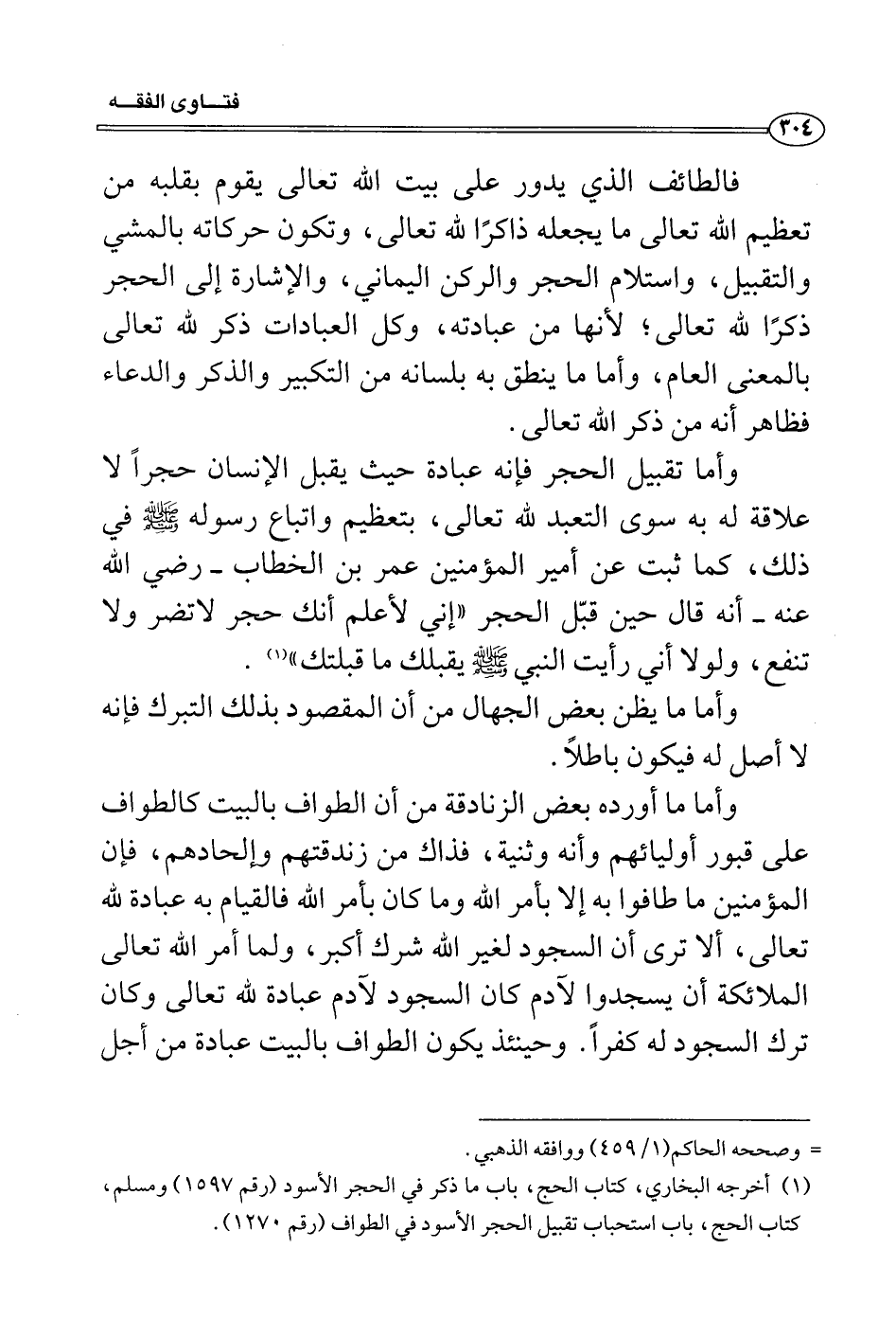 وأما ما أورده بعض الزنادقة من أن الطواف بالبيت كالطواف على قبور أوليائهم وأنه وثنية، فذاك من زندقتهم وإلحادهم، فإن المؤمنين ما طافوا به إلا بأمر الله وما كان بأمر الله فالقيام به عبادة لله