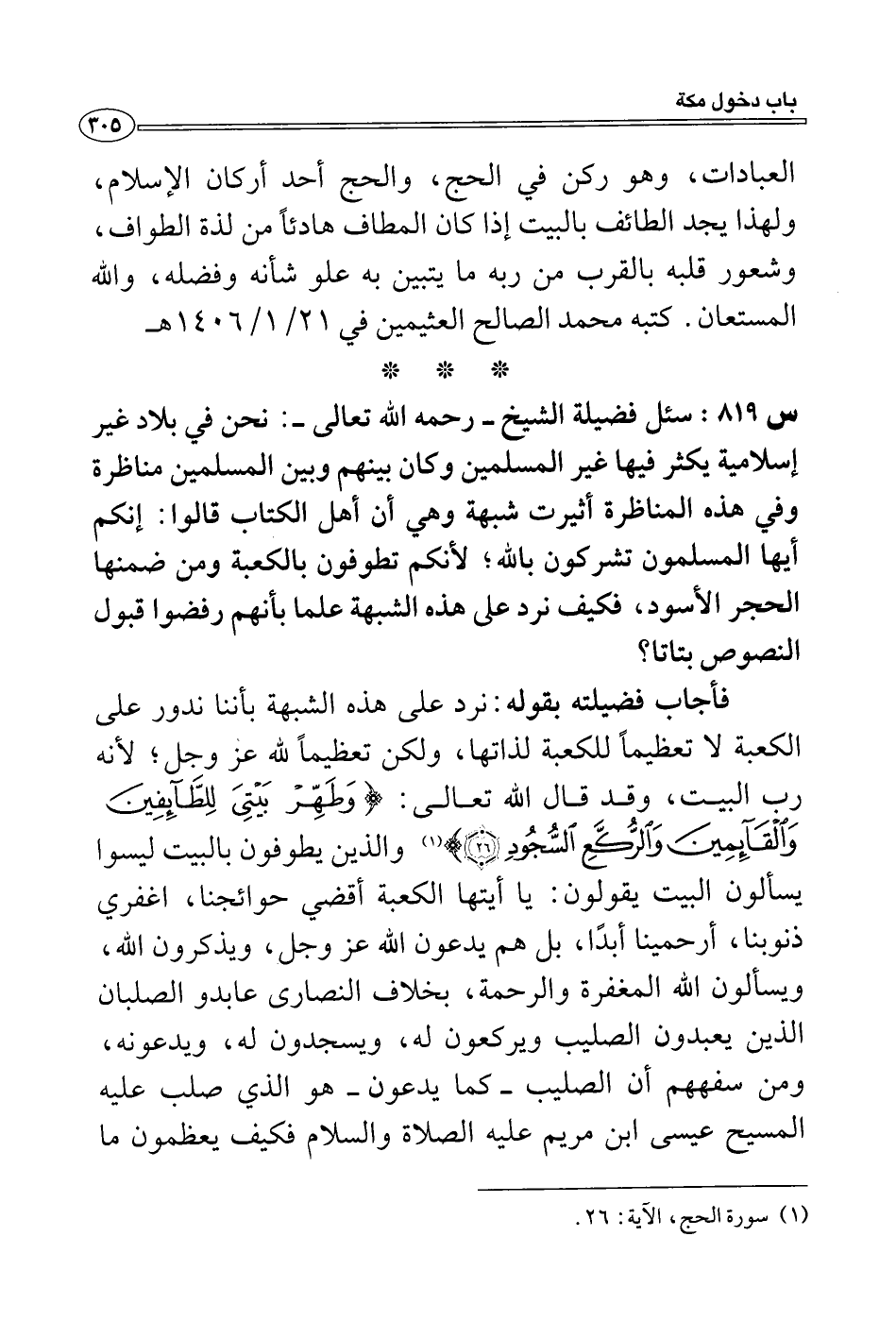 فأجاب فضيلته بقوله: نرد على هذه الشبهة بأننا ندور على الكعبة لا تعظيماً للكعبة لذاتها، ولكن تعظيماً لله عز وجل " لأنه رب البيت، وقد قال الله تعالى: وَطَهِّرْ بَيْتِيَ لِلطَّائِفِينَ وَالْقَائِمِينَ وَالرُّكَّعِ السُّجُودِ (26)) (1) والذين يطوفون بالبيت ليسوا يسألون البيت يقولون: يا أيتها الكعبة أقضي حوائجنا، اغفري ذنوبنا، أرحمينا أبداً، بل هم يدعون الله عز وجل، ويذكرون الله، ويسألون الله المغفرة والرحمة، بخلاف النصارى عابدو الصلبان الذين يعبدون الصليب ويركعون له، ويسجدون له، ويدعونه، ومن سفههم أن الصليب- كما يدعون- هو الذي صلب عليه المسيح عيسى ابن مريم عليه الصلاة والسلام فكيف يعظمون ما