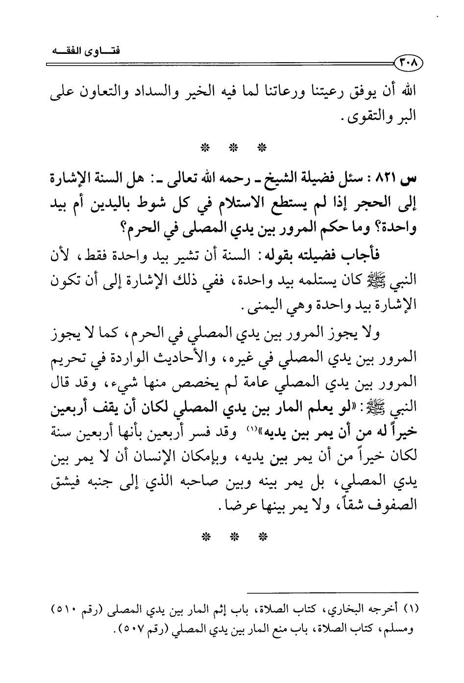 س 821: سئل فضيلة الشيخ- رحمه الله تعالى-: هل السنة الإشارة إلى الحجر إذا لم يستطع الاستلام في كلل شوط باليدين أم بيد واحدة؟ وما حكم المرور بين يدي المصلى في الحرم؟