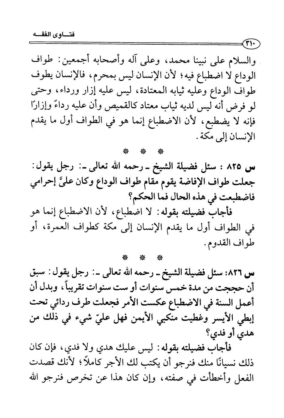 س 825: سئل فضيلة الشيخ- رحمه الله تعالى-: رجل يقول: جعلت طواف الإفاضة يقوم مقام طواف الوداع وكان علىَّ إحرامي فاضطبعت في هذه الحال فما الحكم؟
