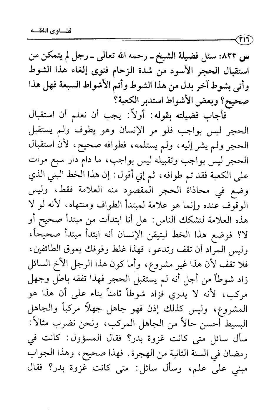 س 833: سئل فضيلة الشيخ- رحمه الله تعالى- رجل لم يتمكن من استقبال الحجر الأسود من شدة الزحام فنوى إلغاء هذا الشوط وأتى بشوط آخر بدل من هذا الشوط وأتم الأشواط السبعة فهل هذا صحيح؟ وبعض الأشواط استدبر الكعبة؟