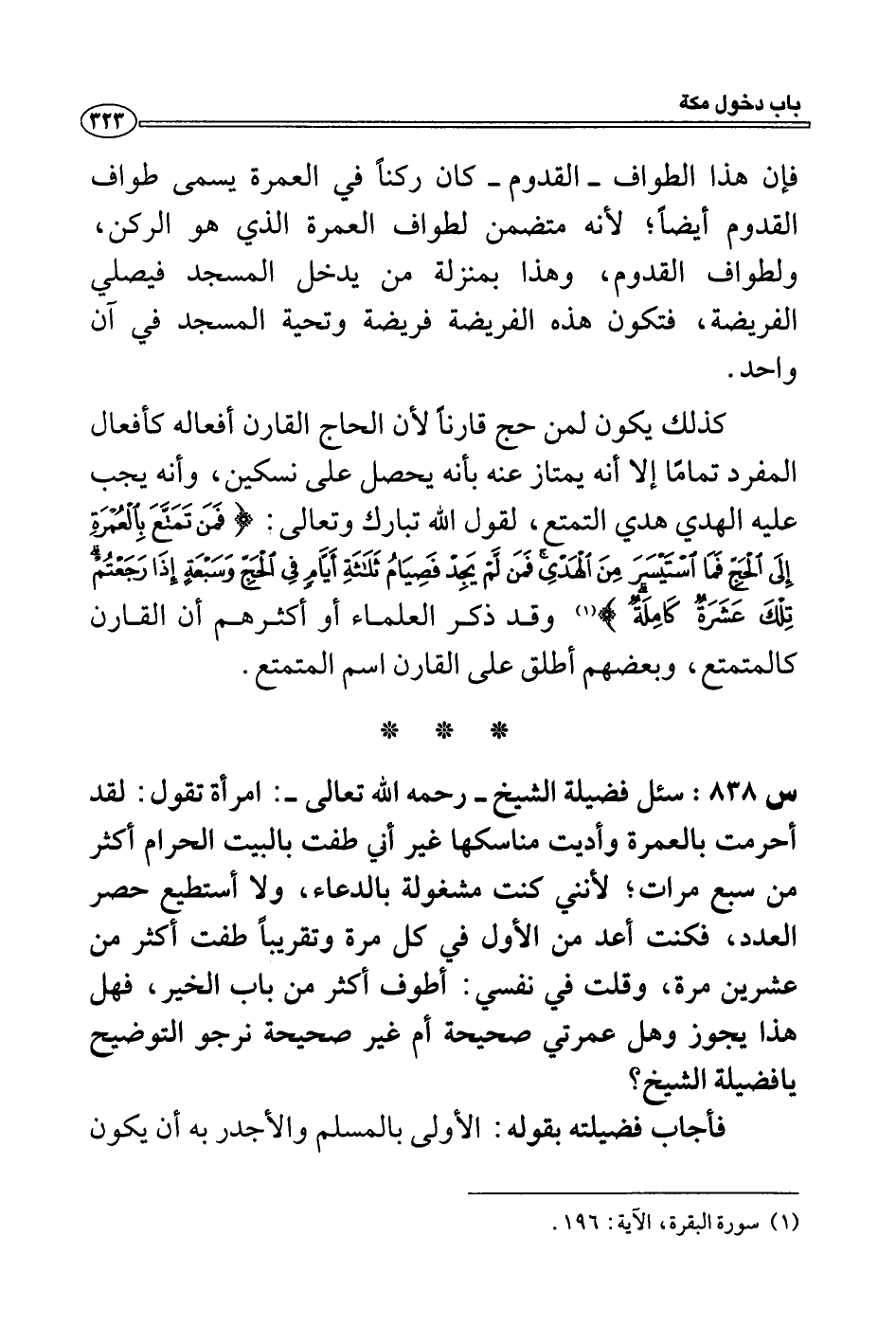 س 838: سئل فضيلة الشيخ- رحمه الله تعالى-: امرأة تقول: لقد أحرمت بالعمرة وأديت مناسكها غير أني طفت بالبيت الحرام أكثر من سبع مرات؛ لأنني كنت مشغولة بالدعاء، ولا أستطيع حصر