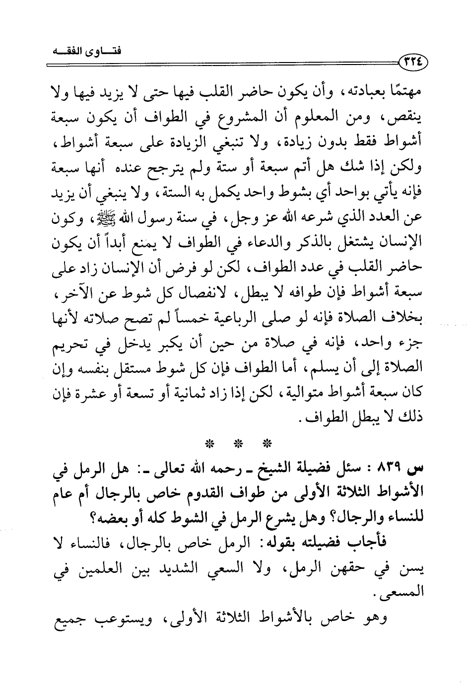س 839: سئل فضيلة الشيخ- رحمه الله تعالى-: هل الرمل في الأشواط الثلاثة الأولى من طواف القدوم خاص بالرجال أم عام للنساء والرجال؟ وهل يشرع الرمل في الشوط كله أو بعضه؟