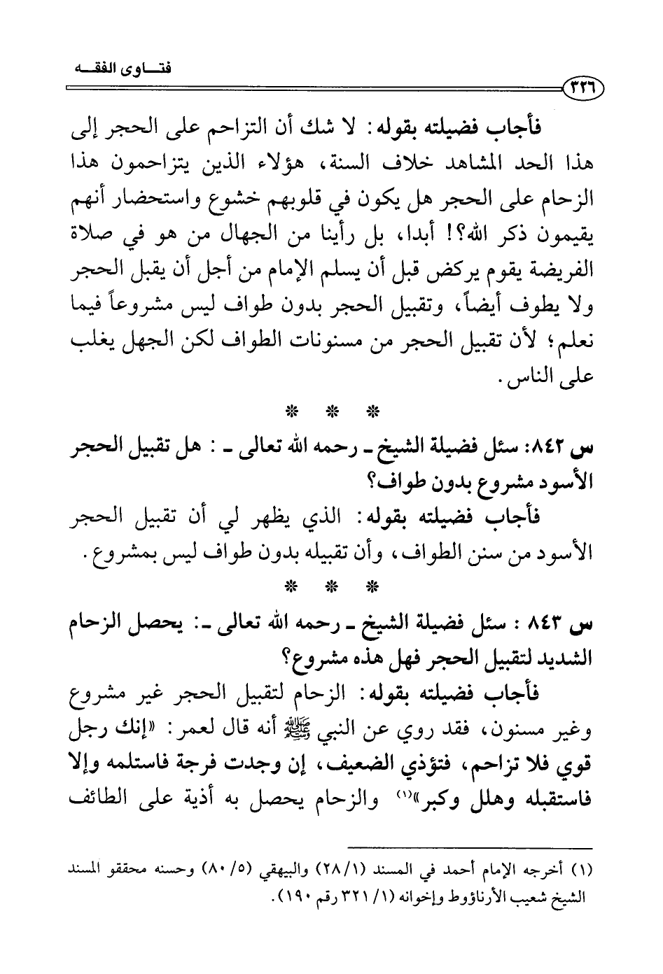 فأجاب فضيلته بقوله: لا شك أن التزاحم على الحجر إلى هذا الحد المشاهد خلاف السنة، هؤلاء الذين يتزاحمون هذا الزحام على الحجر هل يكون في قلوبهم خشوع واستحضار أنهم يقيمون ذكر الله؟! أبداً، بل رأينا من الجهال من هو في صلاة الفريضة يقوم يركض قبل أن يسلم الإمام من أجل أن يقبل الحجر ولا يطوف أيضاً، وتقبيل الحجر بدون طواف ليس مشروعاً فيما نعلم؛ لأن تقبيل الحجر من مسنونات الطواف لكن الجهل يغلب على الناس.