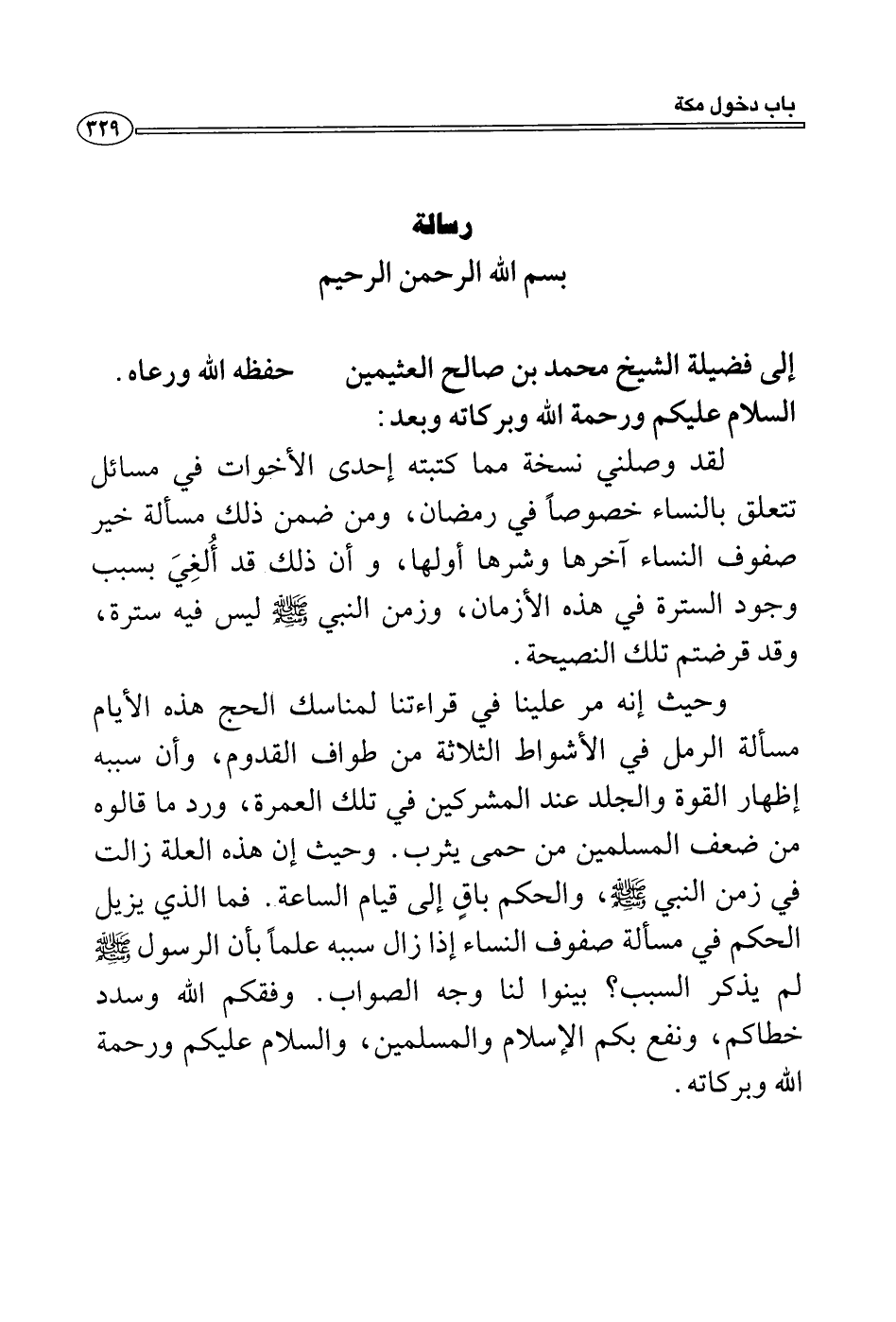 وحيث إنه مر علينا في قراءتنا لمناسك الحج هذه الأيام مسألة الرمل في الأشواط الثلاثة من طواف القدوم، وأن سببه إظهار القوة والجلد عند المشركين في تلك العمرة، ورد ما قالوه من ضعف المسلمين من حمى يثرب. وحيث إن هذه العلة زالت في زمن النبي - صلى الله عليه وسلم -، والحكم باقٍ إلى قيام الساعة. فما الذي يزيل الحكم في مسألة صفوف النساء إذا زال سببه علماً بأن الرسول - صلى الله عليه وسلم - لم يذكر السبب؟ بينوا لنا وجه الصواب. وفقكم الله وسدد