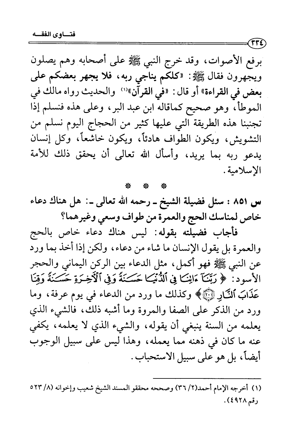 برفع الأصوات، وقد خرج النبي - صلى الله عليه وسلم - على أصحابه وهم يصلون ويجهرون فقال - صلى الله عليه وسلم -: "كلكم يناجي ربه، فلا يجهر بعضكم على بعض في القراءة" أو قال: "في القرآن " (1) والحديث رواه مالك في الموطأ، وهو صحيح كما قاله ابن عبد البر، وعلى هذه فنسلم إذا تجنبنا هذه الطريقة التي عليها كثير من الحجاج اليوم نسلم من التشويش، ويكون الطواف هادئاً، ويكون خاشعاً، وكل إنسان يدعو ربه بما يريد، وأسأل الله تعالى أن يحقق ذلك للأمة