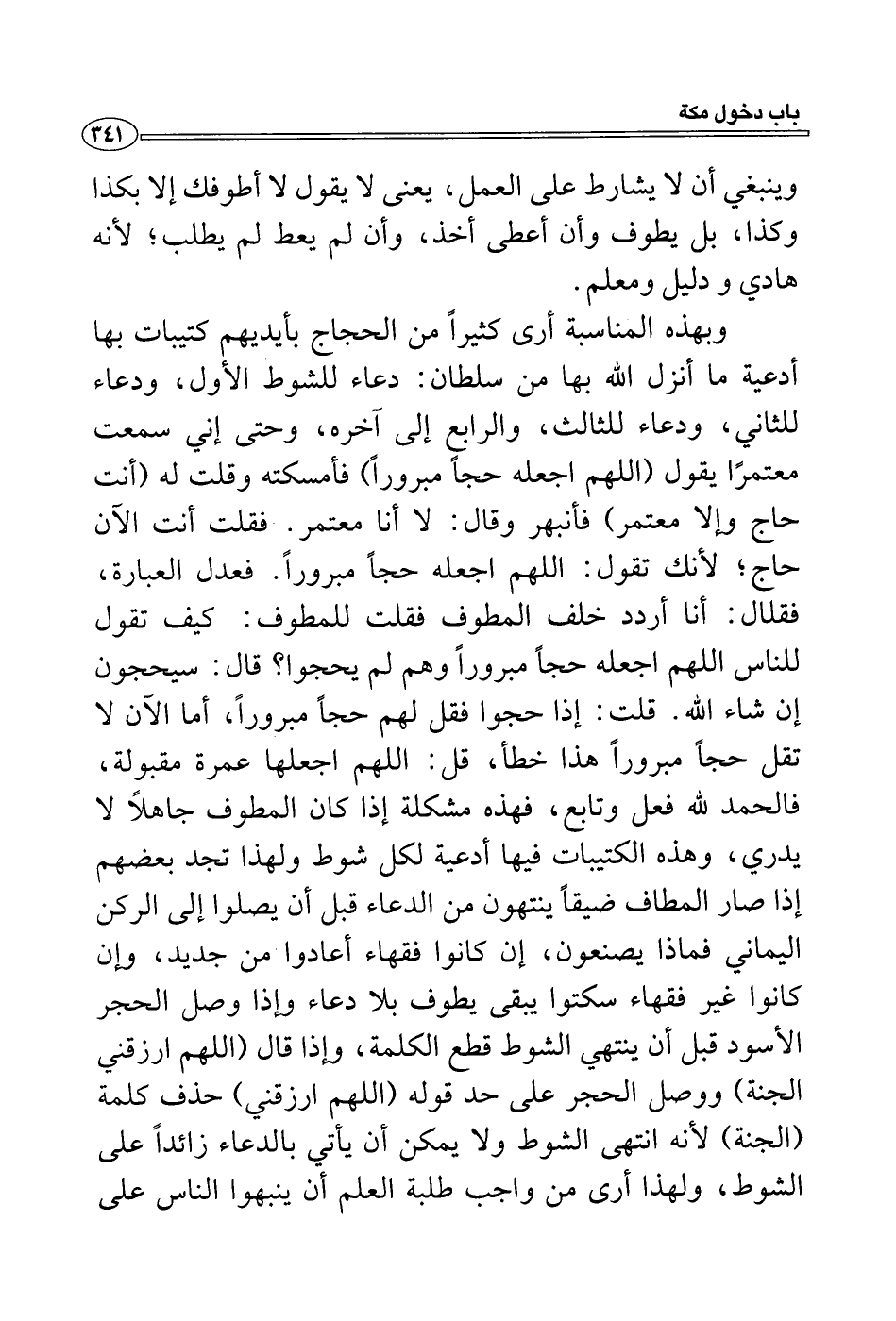 وبهذه المناسبة أرى كثيراً من الحجاج بأيديهم كتيبات بها أدعية ما أنزل الله بها من سلطان: دعاء للشوط الأول، ودعاء للثاني، ودعاء للثالث، والرابع إلى آخره، وحتى إني سمعت معتمرًا يقول (اللهم اجعله حجاً مبروراً) فأمسكته وقلت له (أنت حاج وإلا معتمر) فأنبهر وقال: لا أنا معتمر. فقلت أما الآن حاج؛ لأنك تقول: اللهم اجعله حجاً مبروراً. فعدل العبارة، فقال: أنا أردد خلف المطوف فقلت للمطوف: كيف تقول للناس اللهم اجعله حجاً مبروراً وهم لم يحجوا؛ قال: