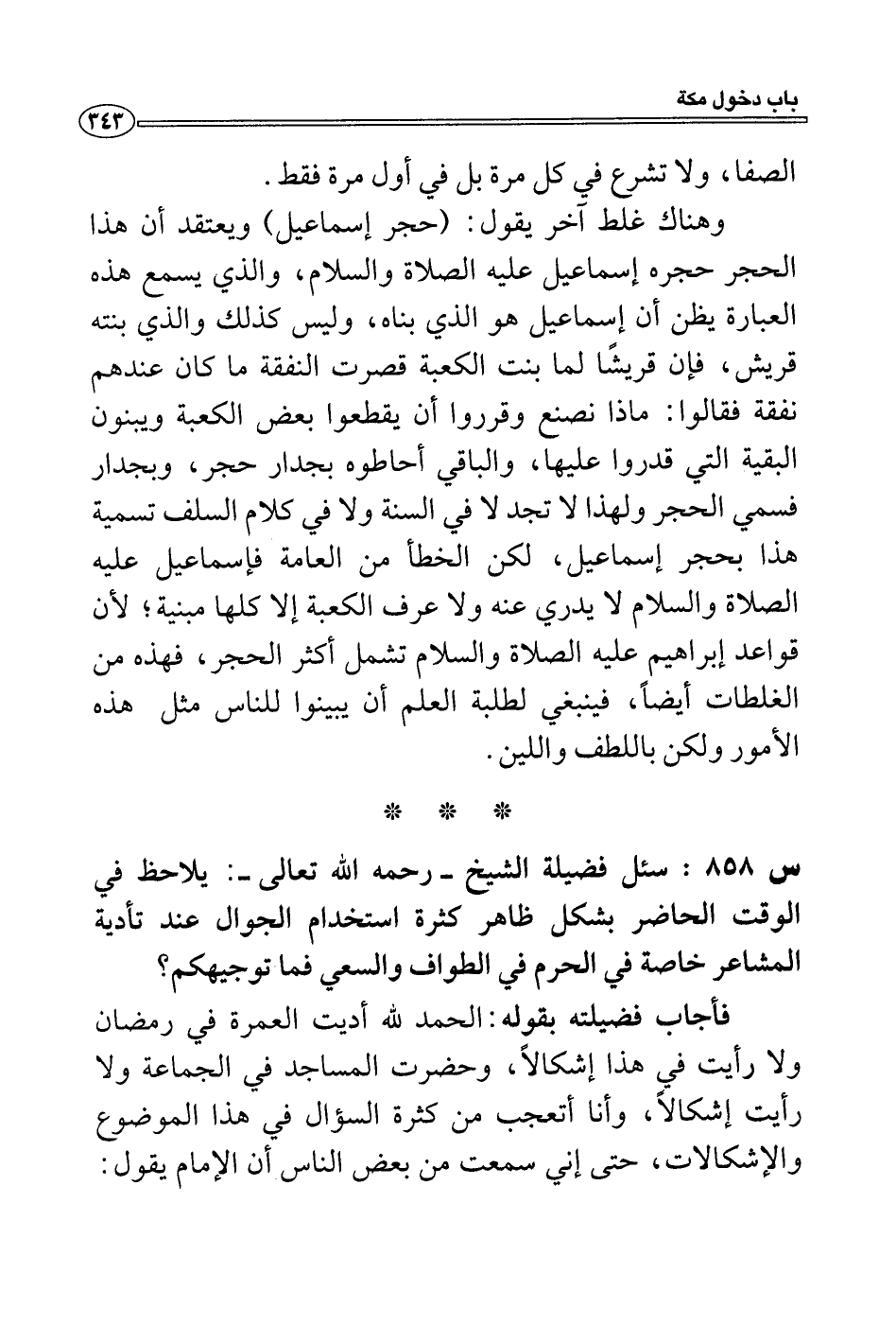س 858: سئل فضيلة الشيخ- رحمه الله تعالى-: يلاحظ في الوقت الحاضر بشكل ظاهر كثرة استخدام الجوال عند تأدية المشاعر خاصة في الحرم في الطواف والسعي فما توجيهكم؟