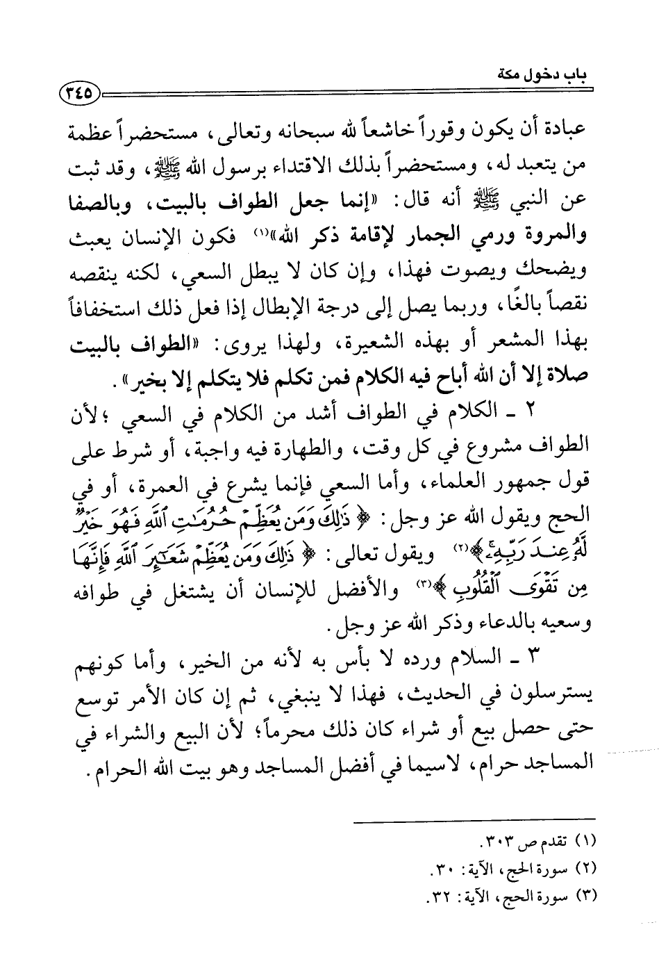 2- الكلام في الطواف أشد من الكلام في السعي؛ لأن الطواف مشروع في كل وقت، والطهارة فيه واجبة، أو شرط على قول جمهور العلماء، وأما السعي فإنما يشرع في العمرة، أو في الحج ويقول الله عز وجل: (ذَلِكَ وَمَنْ يُعَظِّمْ حُرُمَاتِ اللَّهِ فَهُوَ خَيْرٌ لَهُ عِنْدَ رَبِّهِ) (2) ويقول تعالى: (ذَلِكَ وَمَنْ يُعَظِّمْ شَعَائِرَ اللَّهِ فَإِنَّهَا مِنْ تَقْوَى الْقُلُوبِ) (3) والأفضل للإنسان أن يشتغل في طوافه وسعيه بالدعاء وذكر الله عز وجل.