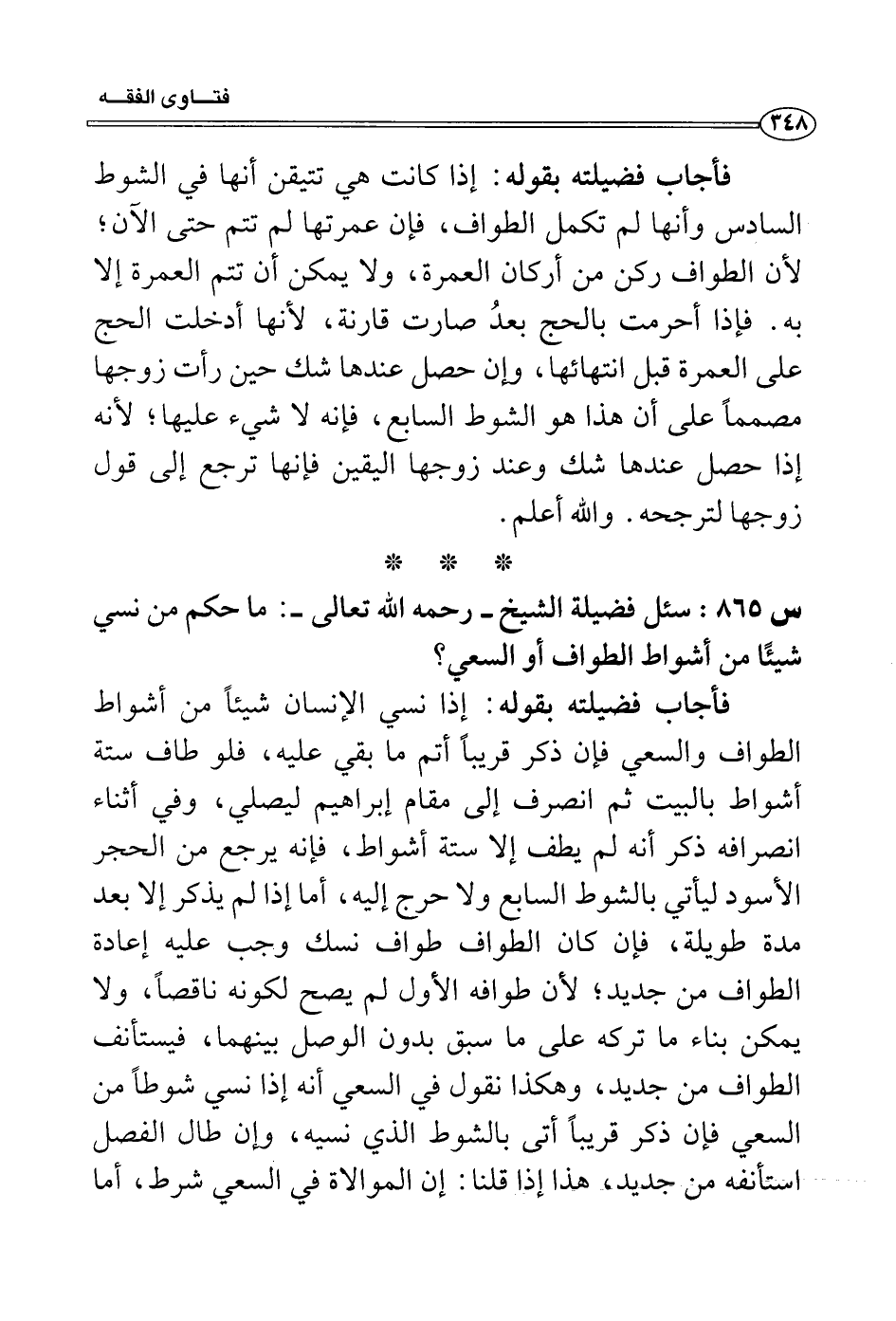 س 865: سئل فضيلة الشيخ- رحمه الله تعالى-: ما حكم من نسي شيئاً من أشواط الطواف أو السعي؟