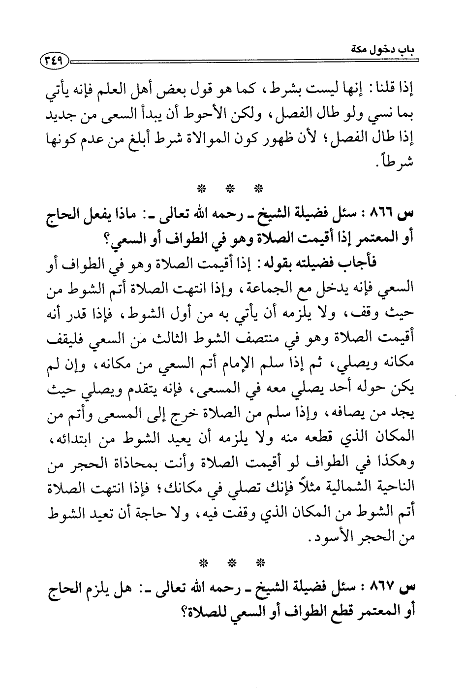س 867: سئل فضيلة الشيخ- رحمه الله تعالى-: هل يلزم الحاج أو المعتمر قطع الطواف أو السعي للصلاة؟