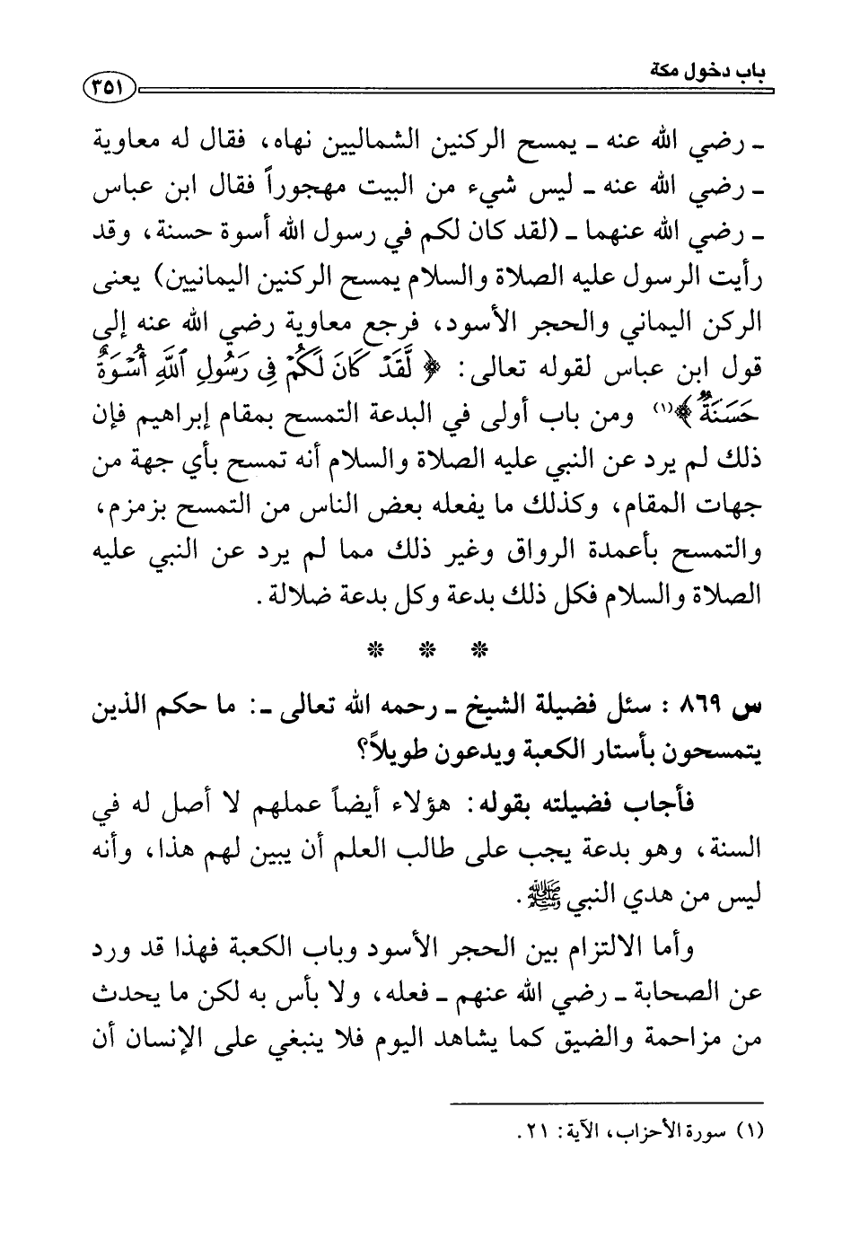 رأيت الرسول عليه الصلاة والسلام يمسح الركنين اليمانيين) يعنى الركن اليماني والحجر الأسود، فرجع معاوية رضي الله عنه إلي قول ابن عباس لقوله تعالى: (لَقَدْ كَانَ لَكُمْ فِي رَسُولِ اللَّهِ أُسْوَةٌ حَسَنَةٌ) (1) ومن باب أولى في البدعة التمسح بمقام إبراهيم فإن ذلك لم يرد عن النبي عليه الصلاة والسلام أنه تمسح بأي جهة من جهات المقام، وكذلك ما يفعله بعض الناس من التمسح بزمزم،