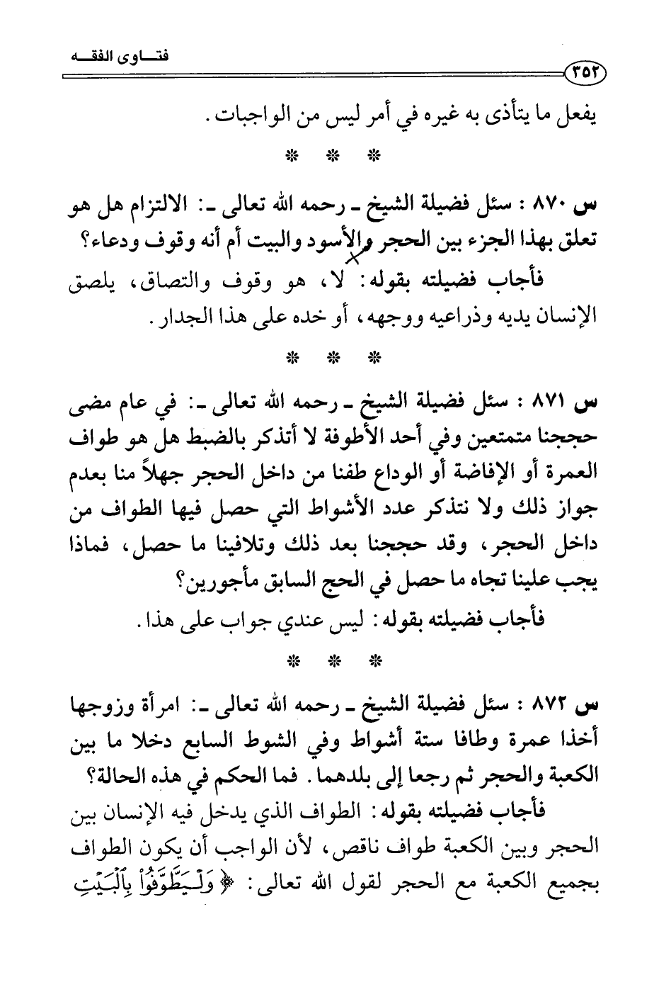 س 871: سئل فضيلة الشيخ- رحمه الله تعالى-: في عام مضى حججنا متمتعين وفي أحد الأطوفة لا أتذكر بالضبط هل هو طواف العمرة أو الإفاضة أو الوداع طفنا من داخل الحجر جهلاً منا بعدم