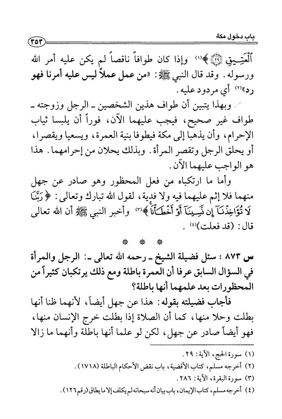وبهذا يتبين أن طواف هذين الشخصين- الرجل وزوجته- طواف غير صحيح، فيجب عليهما الآن، فوراً أن يلبسا ثياب الإحرام، وأن يذهبا إلى مكة فيطوفا بنية العمرة، ويسعيا ويقصرا، أو يحلق الرجل وتقصر المرأة. وبذلك يحلان من إحرامهما. هذا هو الواجب عليهما الآن.