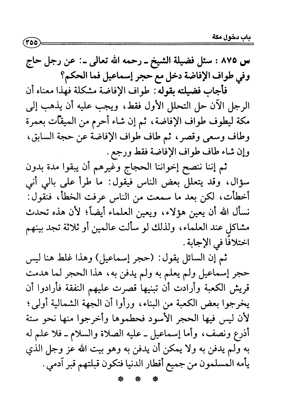 س 875: سئل فضيلة الشيخ- رحمه الله تعالى-: عن رجل حاج وفي طواف الإفاضة دخل مع حجر إسماعيل فما الحكم؟