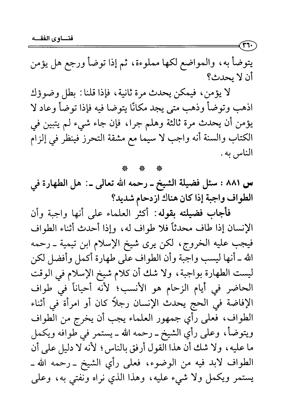س 881: سئل فضيلة الشيخ- رحمه الله تعالى-: هل الطهارة في الطواف واجبة إذا كان هناك ازدحام شديد؟
