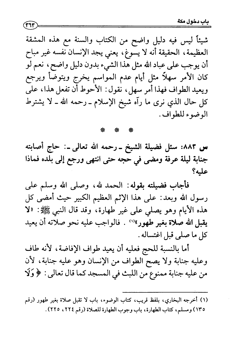 س 883: سئل فضيلة الشيخ- رحمه الله تعالى-: حاج أصابته جنابة ليلة عرفة ومضى في حجه حتى انتهى ورجع إلى بلده فماذا عليه؟